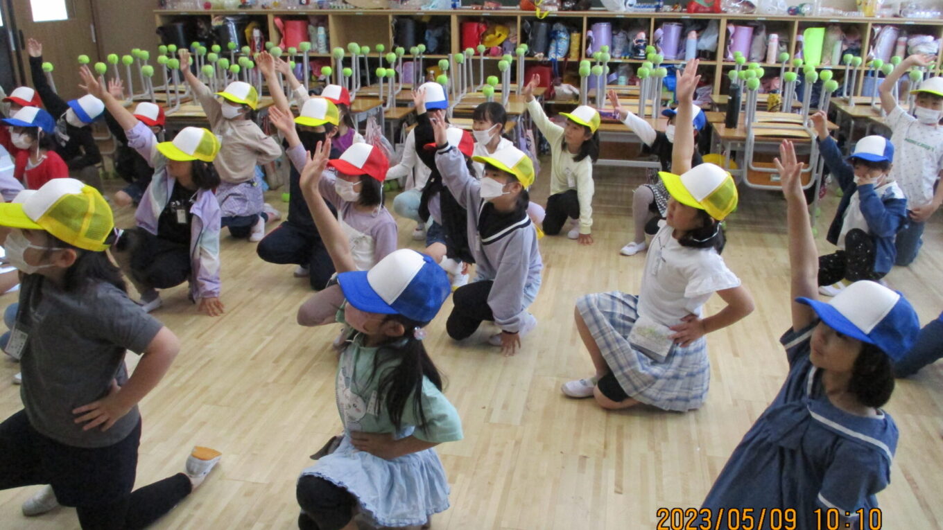 1・2年生は帽子が風に飛ばされないよう、ゴム付きのクリップで服にとめることにしました。