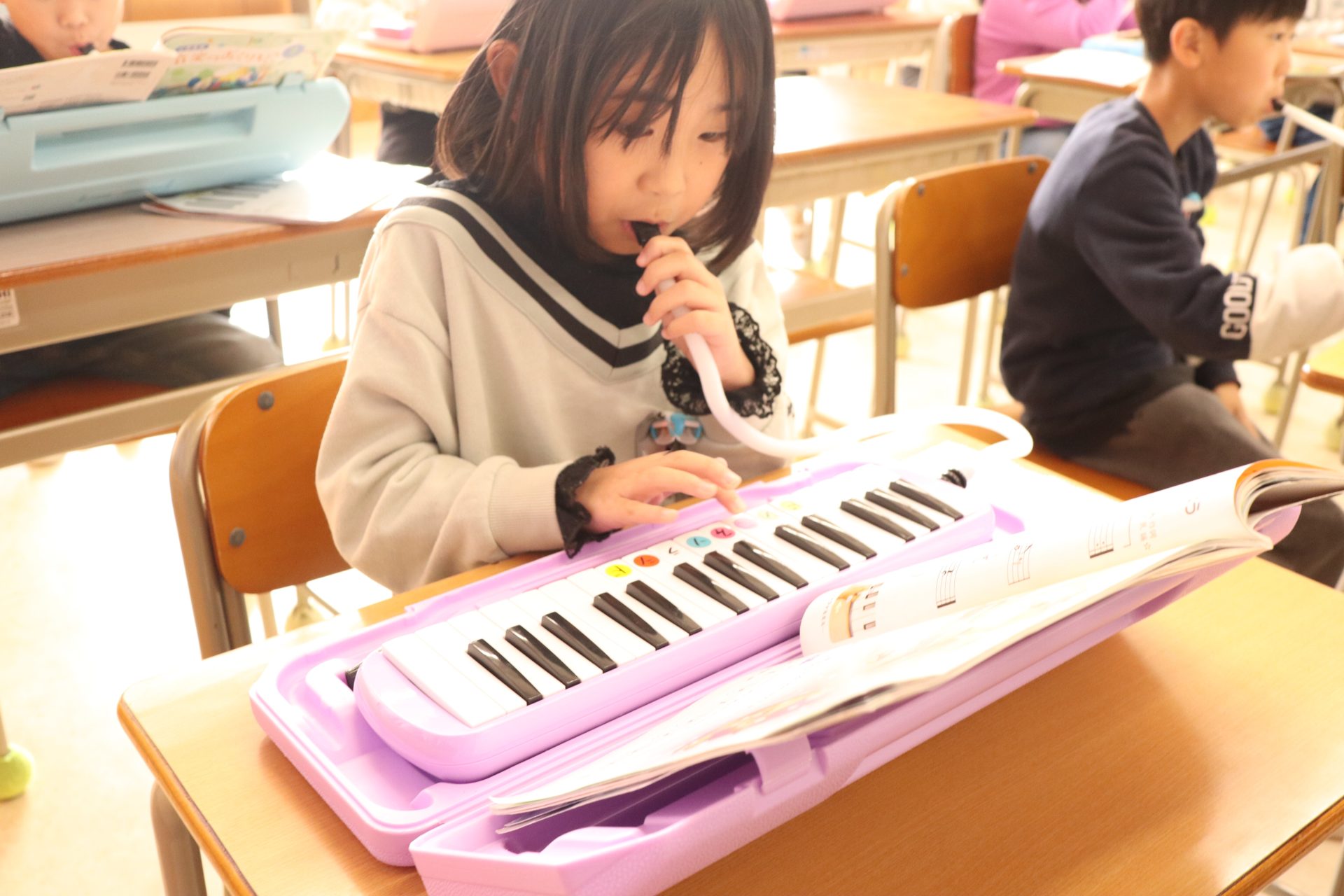 2024.11.20 2年生 音楽を頑張っています 管理者学校 音楽の授業では、鍵盤ハーモニカでの演奏を練習しています。今は「こぎつね」を演奏しています。指遣いが変わるため指の移動が大変ですが、沢山練習してきたおかげで、スムーズに指移動ができるようなってきました。 かけ算も頑張っています。毎日の九九検定では、合格できるようにたくさん練習しています。1~9の段すべて合格すると「かけ算九九 認定証」がもらえます。全員合格を目指して頑張って欲しいです。 #2年生
