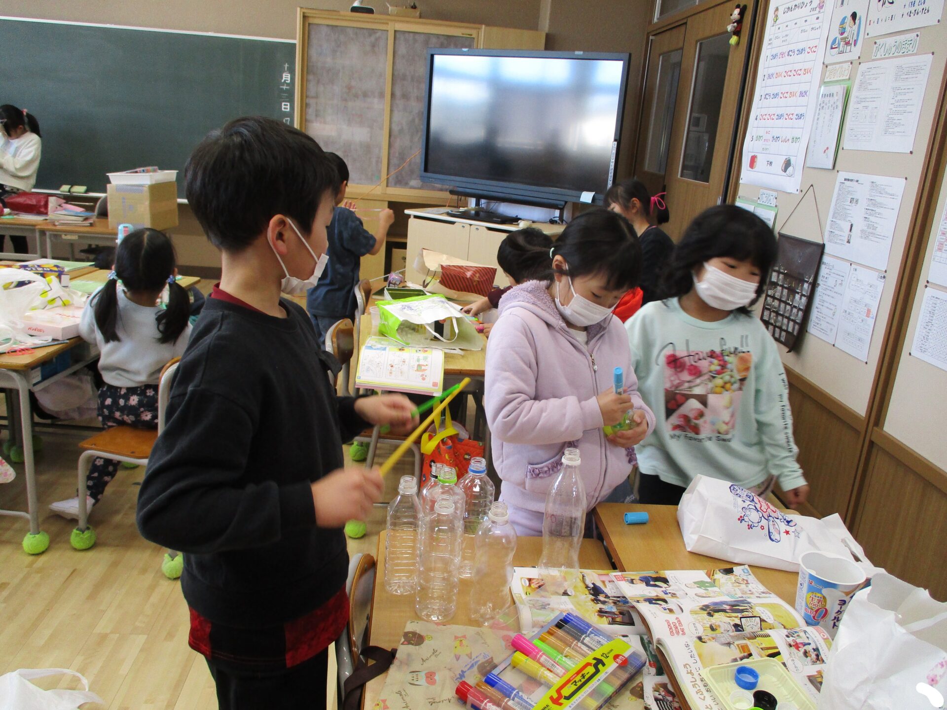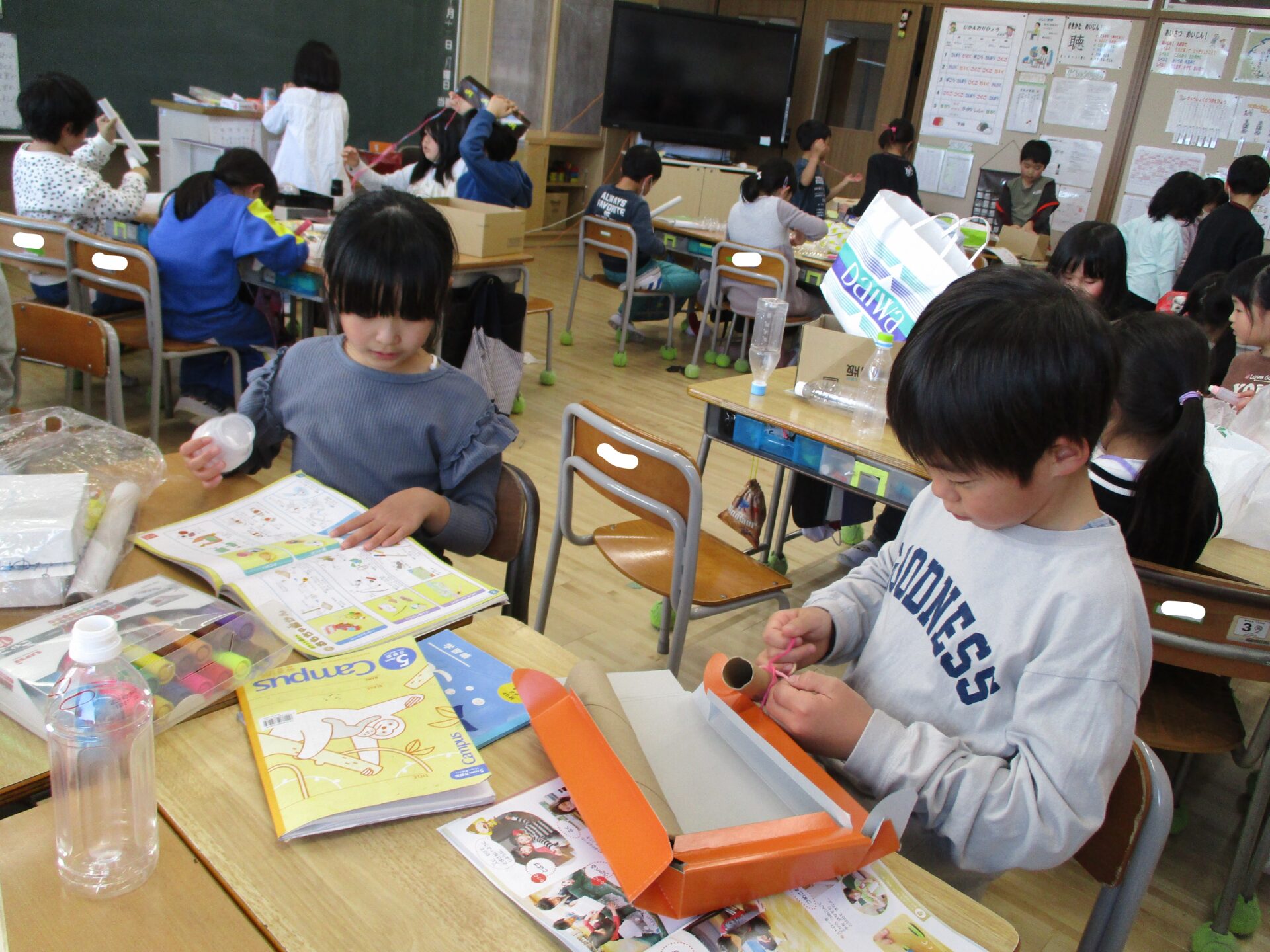 生活科では「おもちゃ名人」目指して、空き箱などで工夫して遊ぶ方法を考えました。