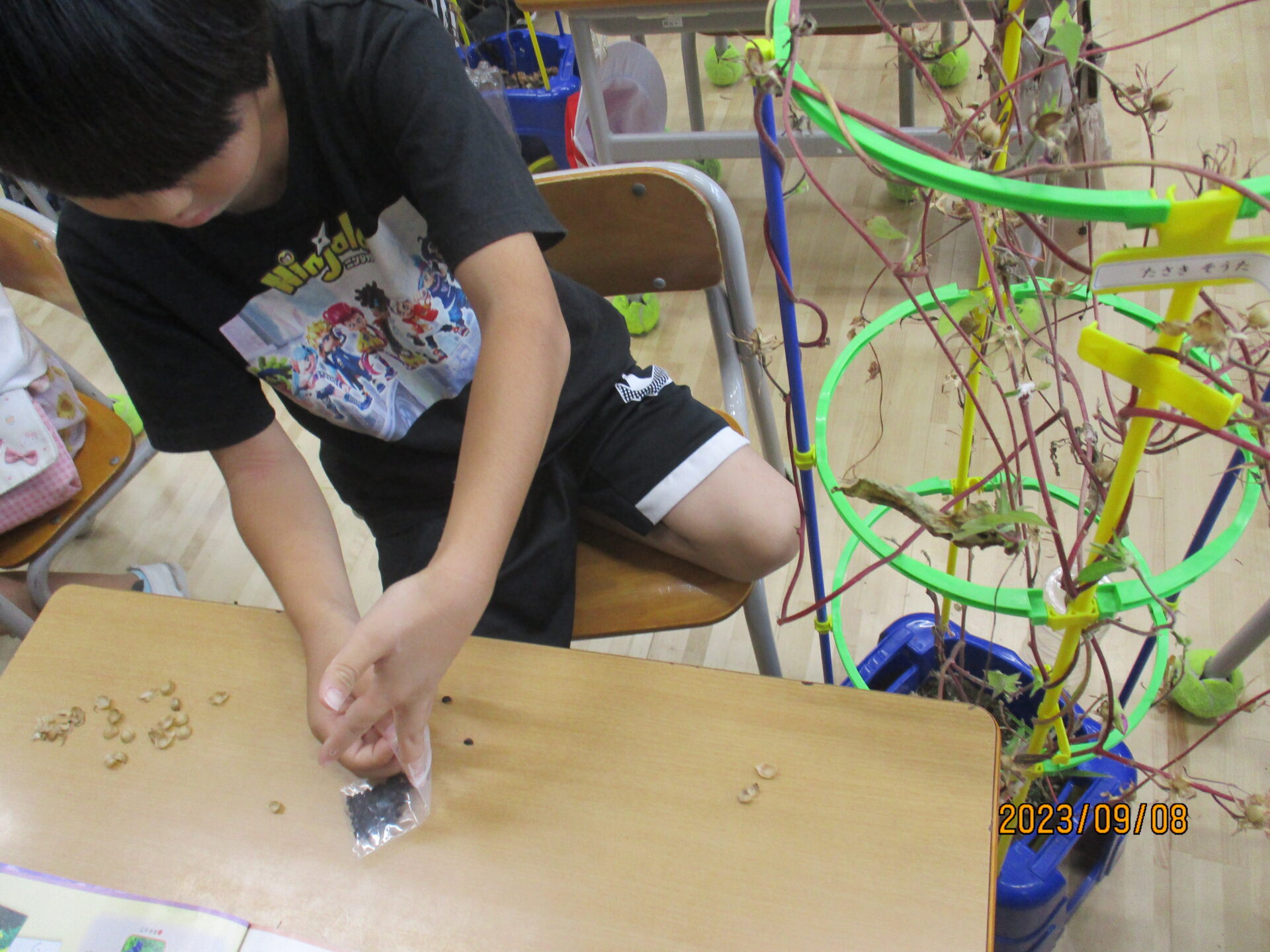 2023.09.08 1年生 あさがおの種を取りました。 管理者学校 生活科で育てたアサガオのたねを取りました。友達と協力してたくさん取ることができました。 「たくさんたねをとって、来年の1年生へプレゼントしたいな。」と1つ1つ丁寧に取っていました。 #1年生