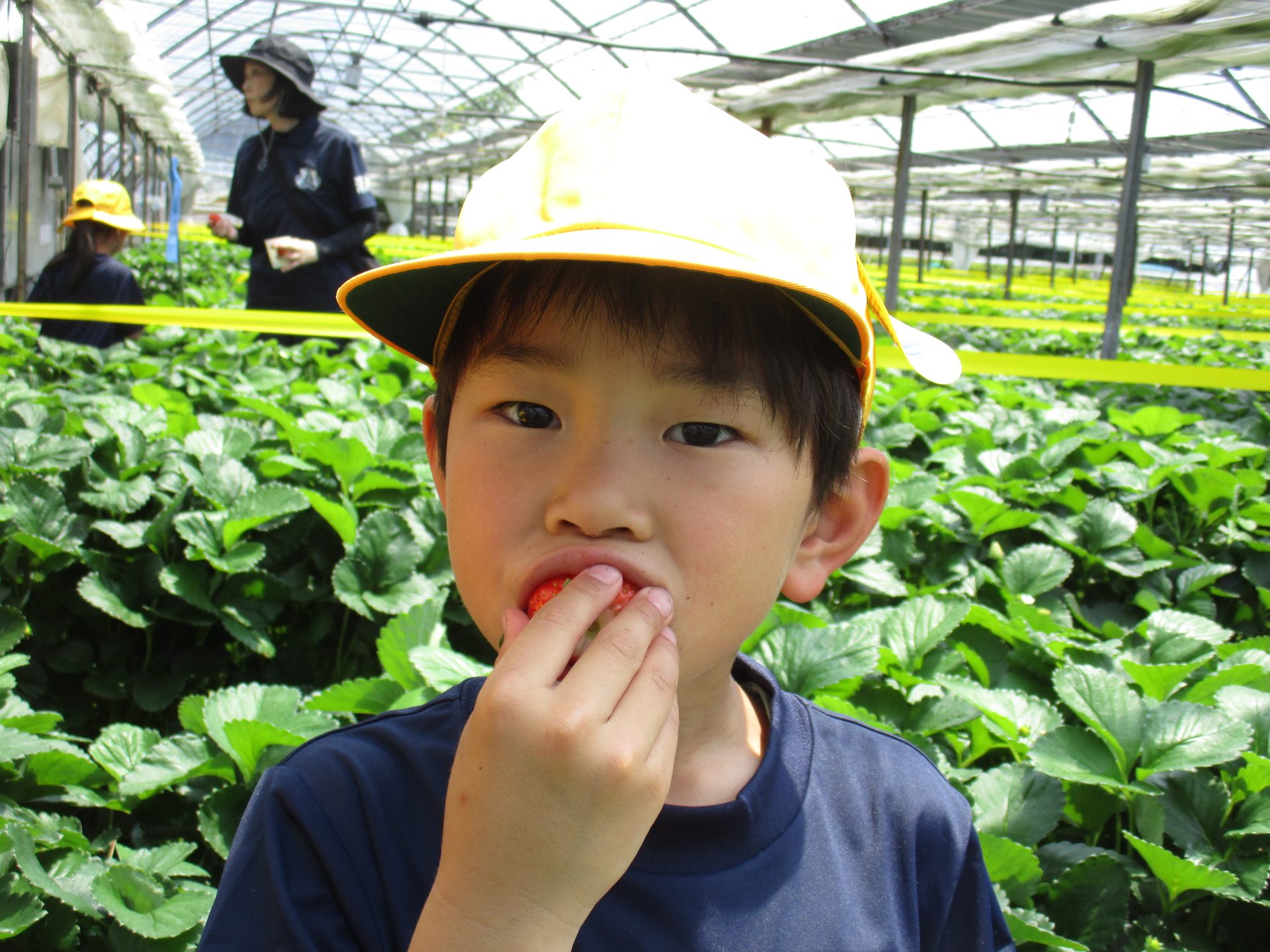 いちごの畝に実際に入り、いちごをいただきました!