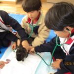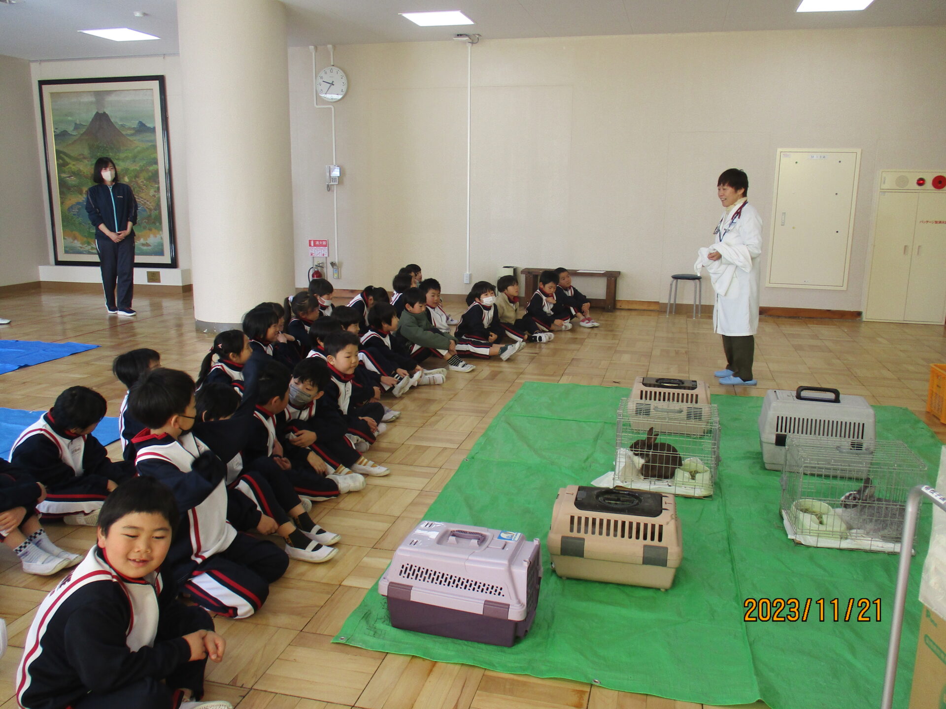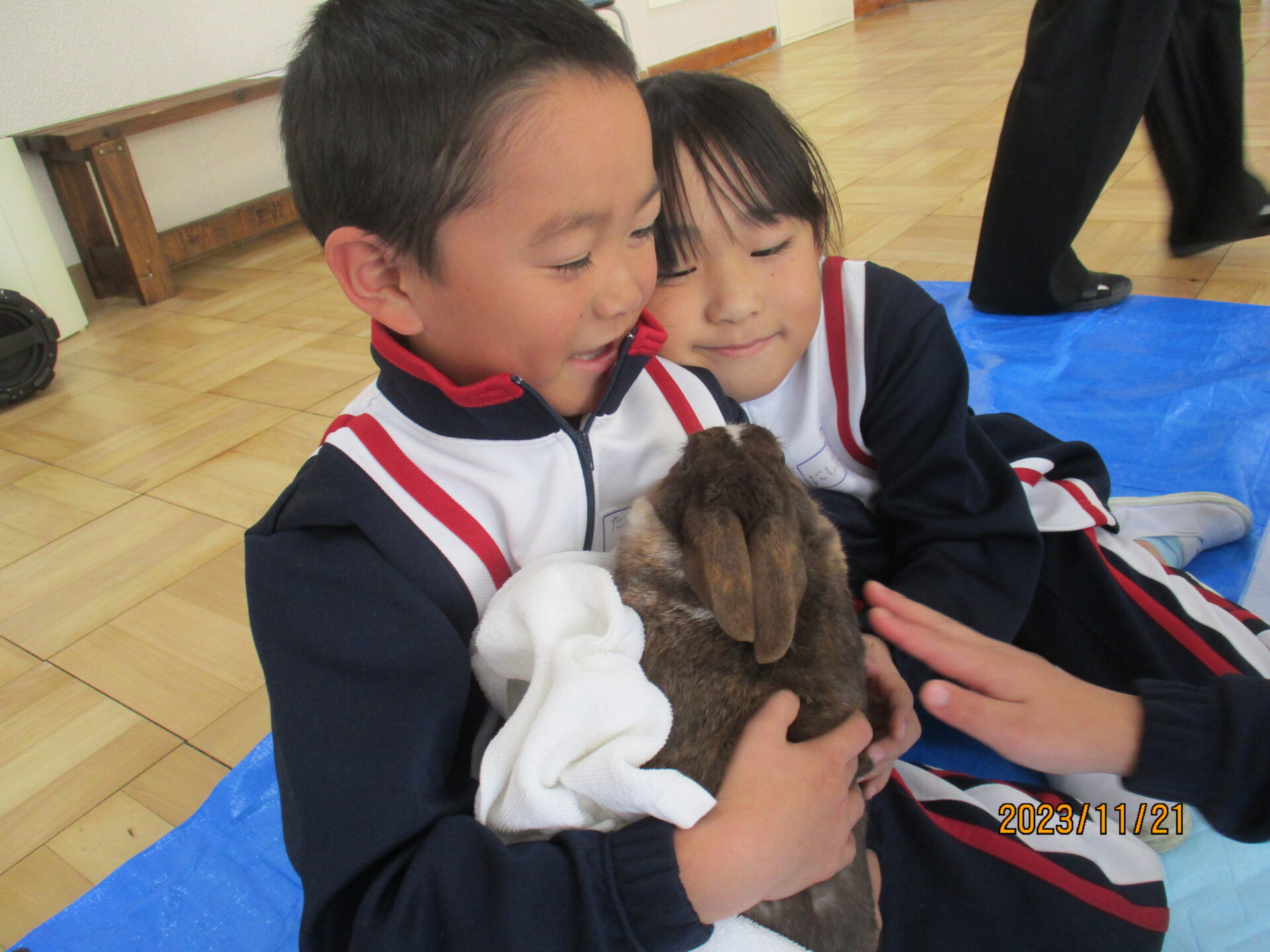 2023.11.22 1年生 うさぎのふれあい授業 管理者学校 11月21日に山びこ動物病病院の先生を講師に迎え、うさぎのふれあい授業ををしました。 うさぎは共英小学校から5羽、旧横林小学校のうさぎを1羽借りてきました。 抱っこの仕方を教えてもらいました。 うさぎの心音と自分の心音を聞き比べてみました。 うさぎと仲良くなれました。 #1年生