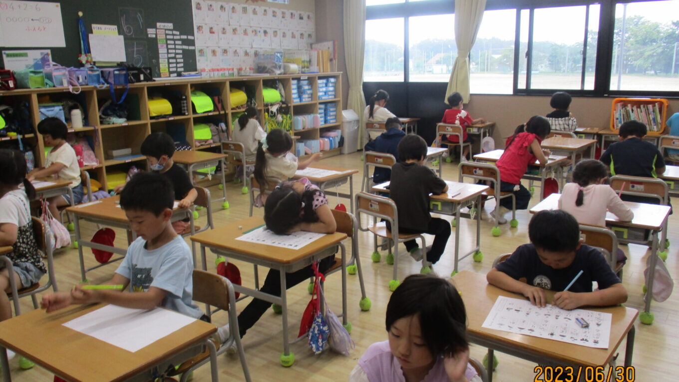 2023.06.30 1年生 はじめてのチャレンジテスト 管理者学校 今日は一年生初めてのひらがなチャレンジテストを行いました。 みんなていねいにひらがなをかきました。 その後は体育です。多目的室で体を動かしました。 #1年生