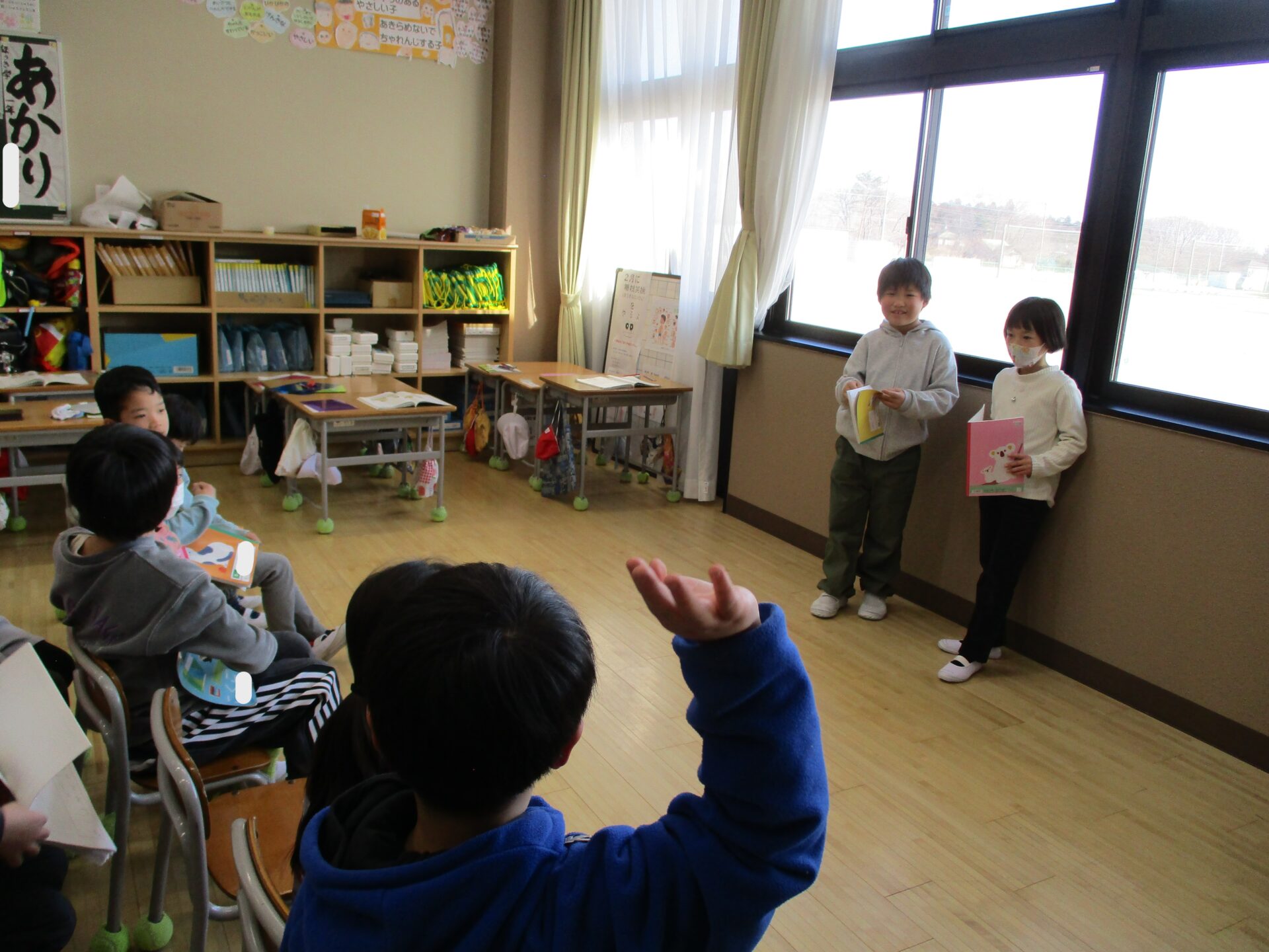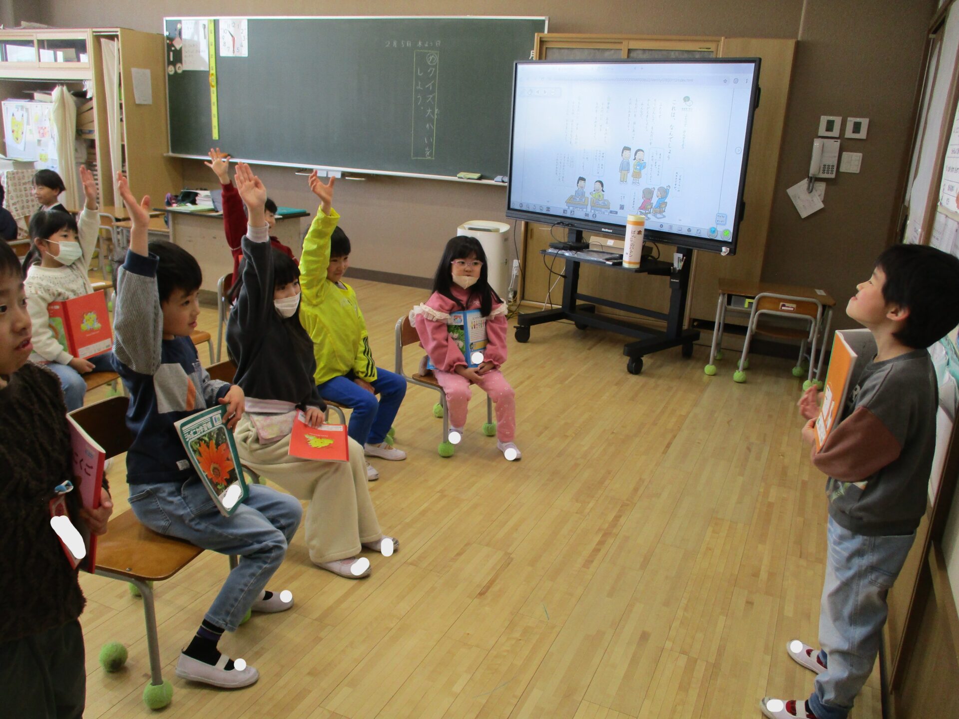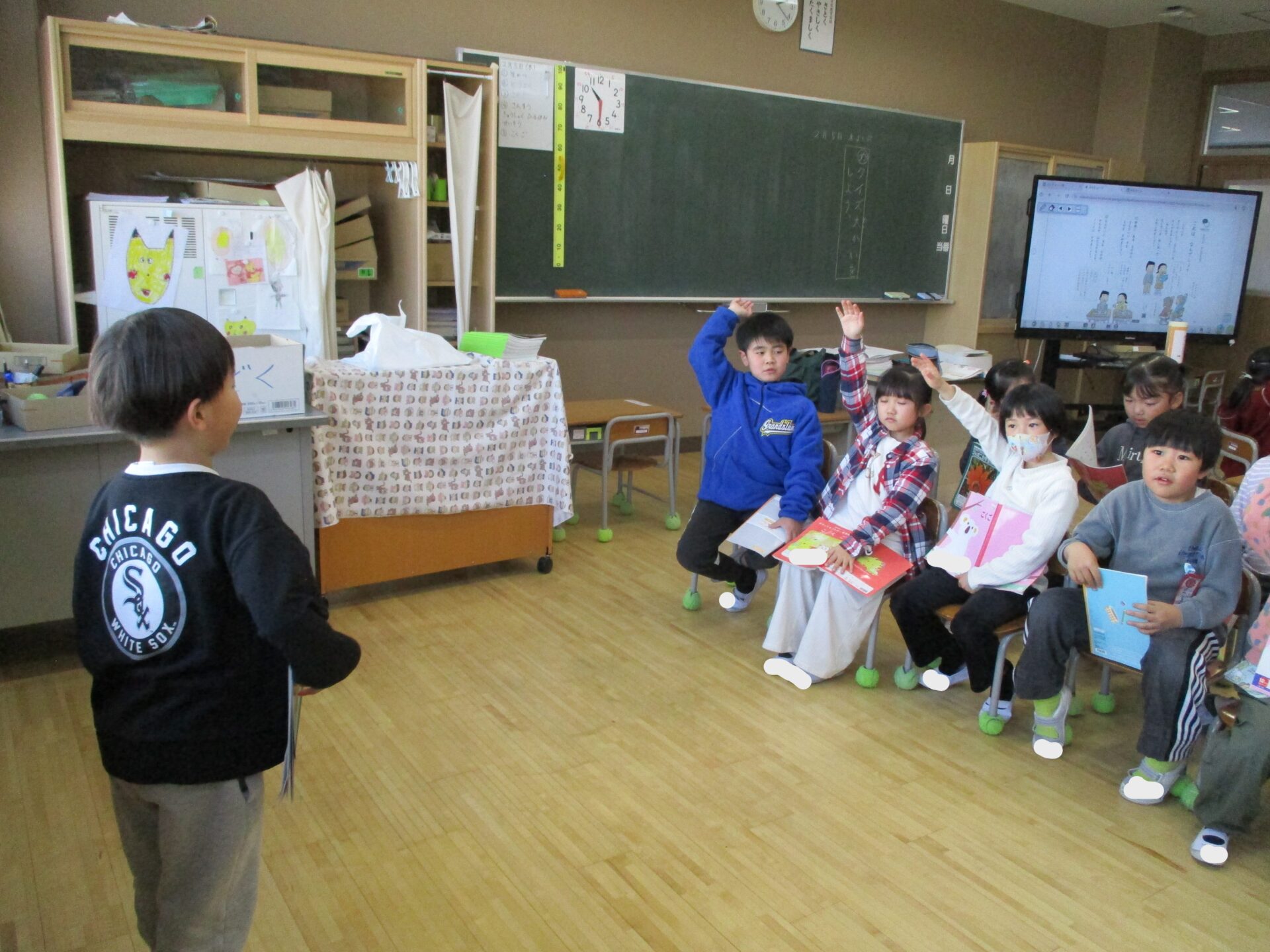 2026.02.05 1年生 クイズ大会 管理者学校 国語の「これは、なんでしょう」の学習でクイズ大会をしました。 学校にあるものの中から特徴を少しずつ言って「これは、なんでしょう。」というクイズをお友達と協力して作りました。 さらにたくさん問題を考えたペアもいたので、また楽しみたいと思います🎵 給食の配膳も自分たちで頑張っています! 学習面も生活面も頑張っている1年生です☺ #1年生