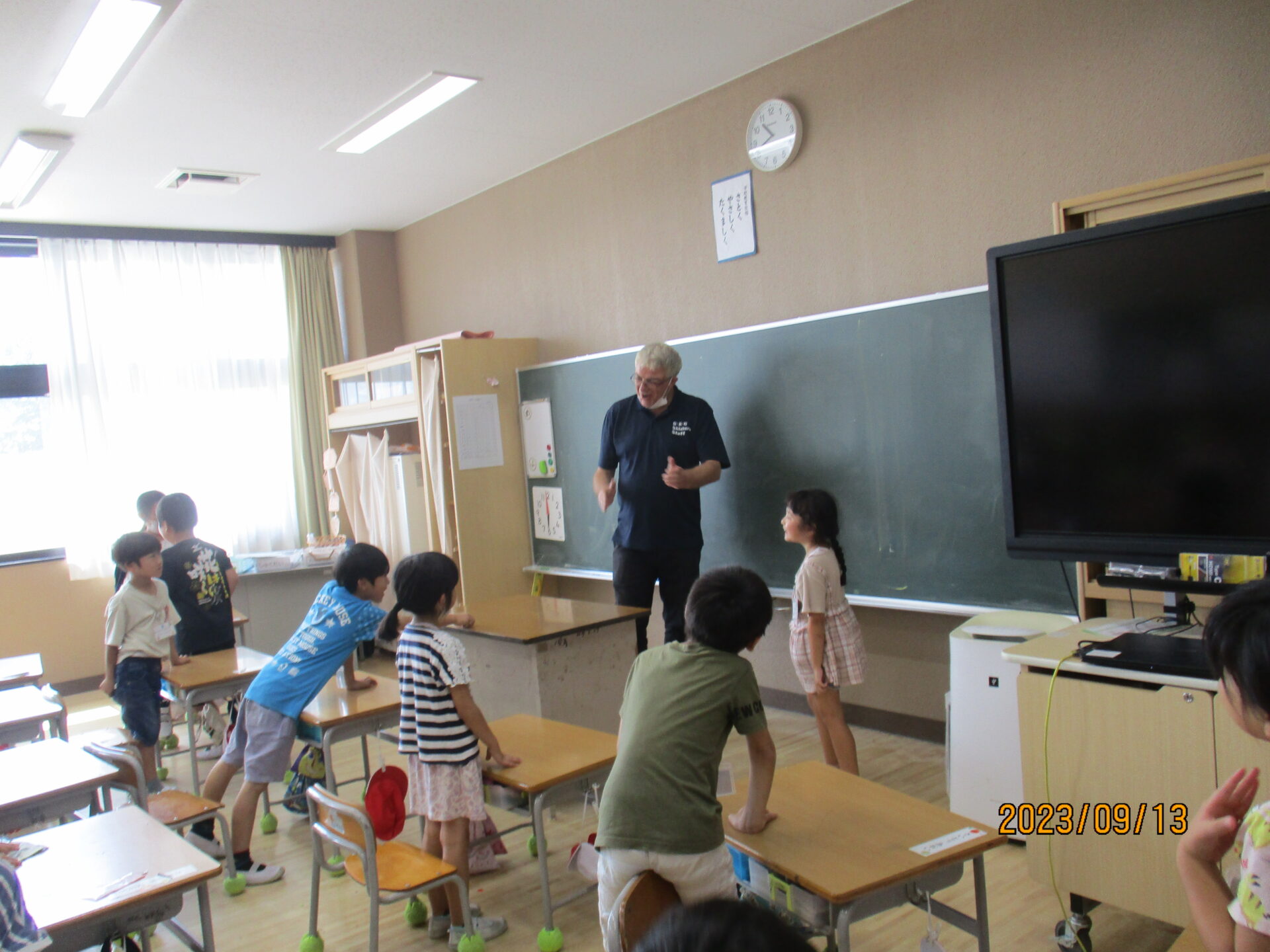 2023.09.13 1年生 マーク先生と授業 管理者学校 今日はALTのマーク先生と英語の授業でした。 My name is~ やNice to meet you. の言い方を楽しく練習しました。 #1年生