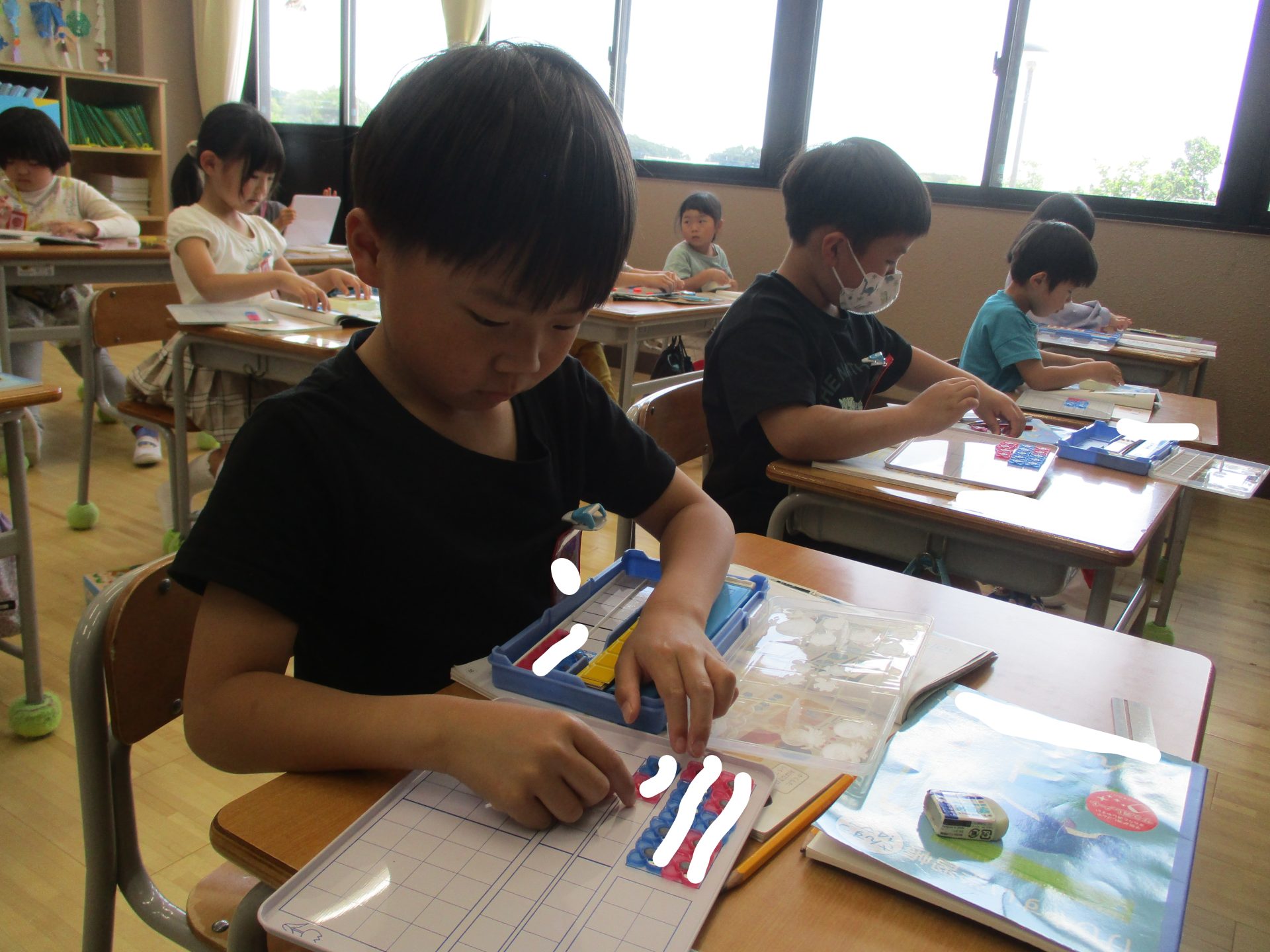 おはじきを並べて、赤のおはじきがいくつ、青のおはじきがいくつか発表しました。
