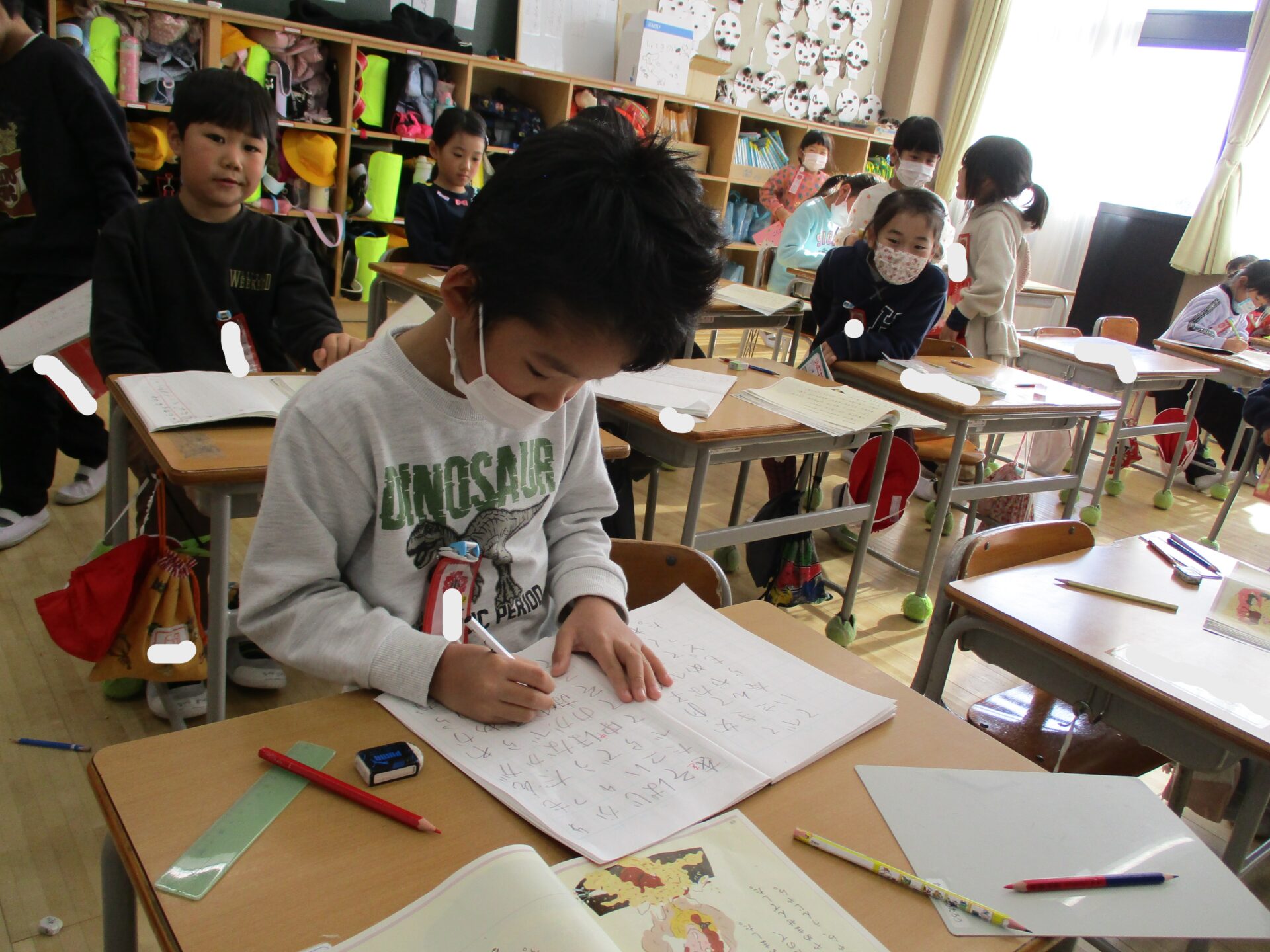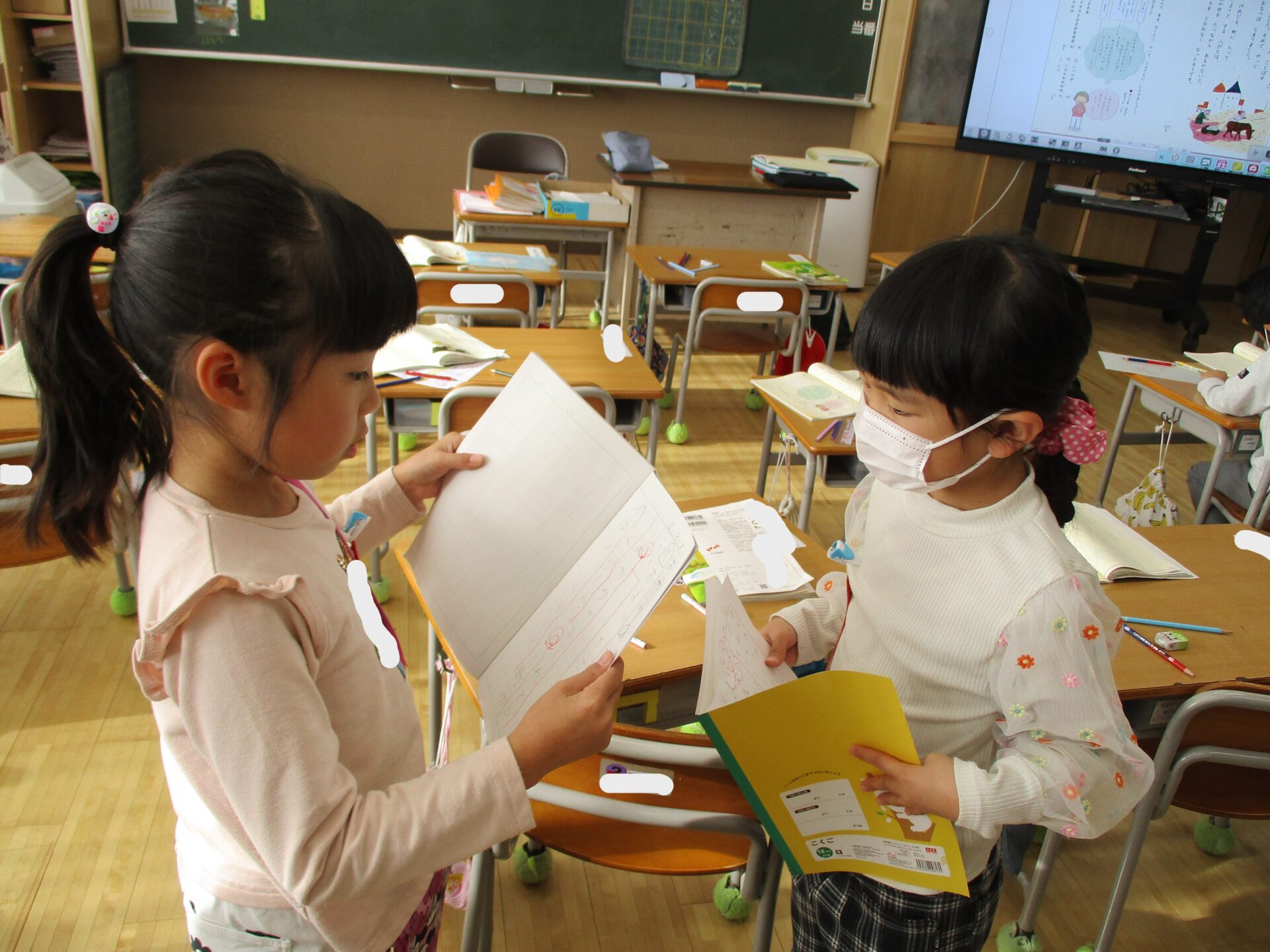 国語の時間には「おかゆのおなべ」を読んだ感想をノートに書き、友達と意見交換をしました。