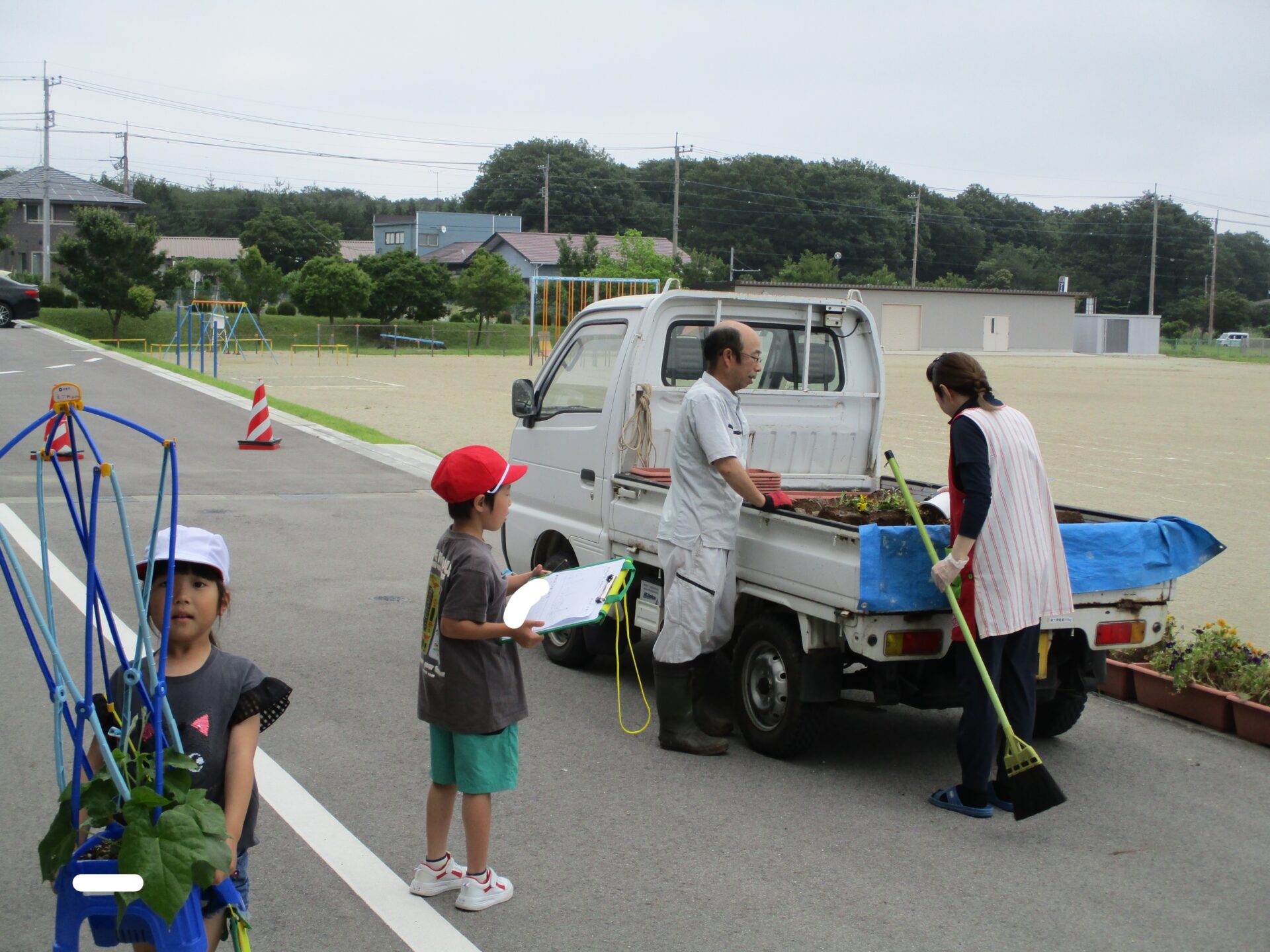 近くで用務員さんが、咲き終わったパンジーの片付けをしていました。