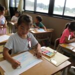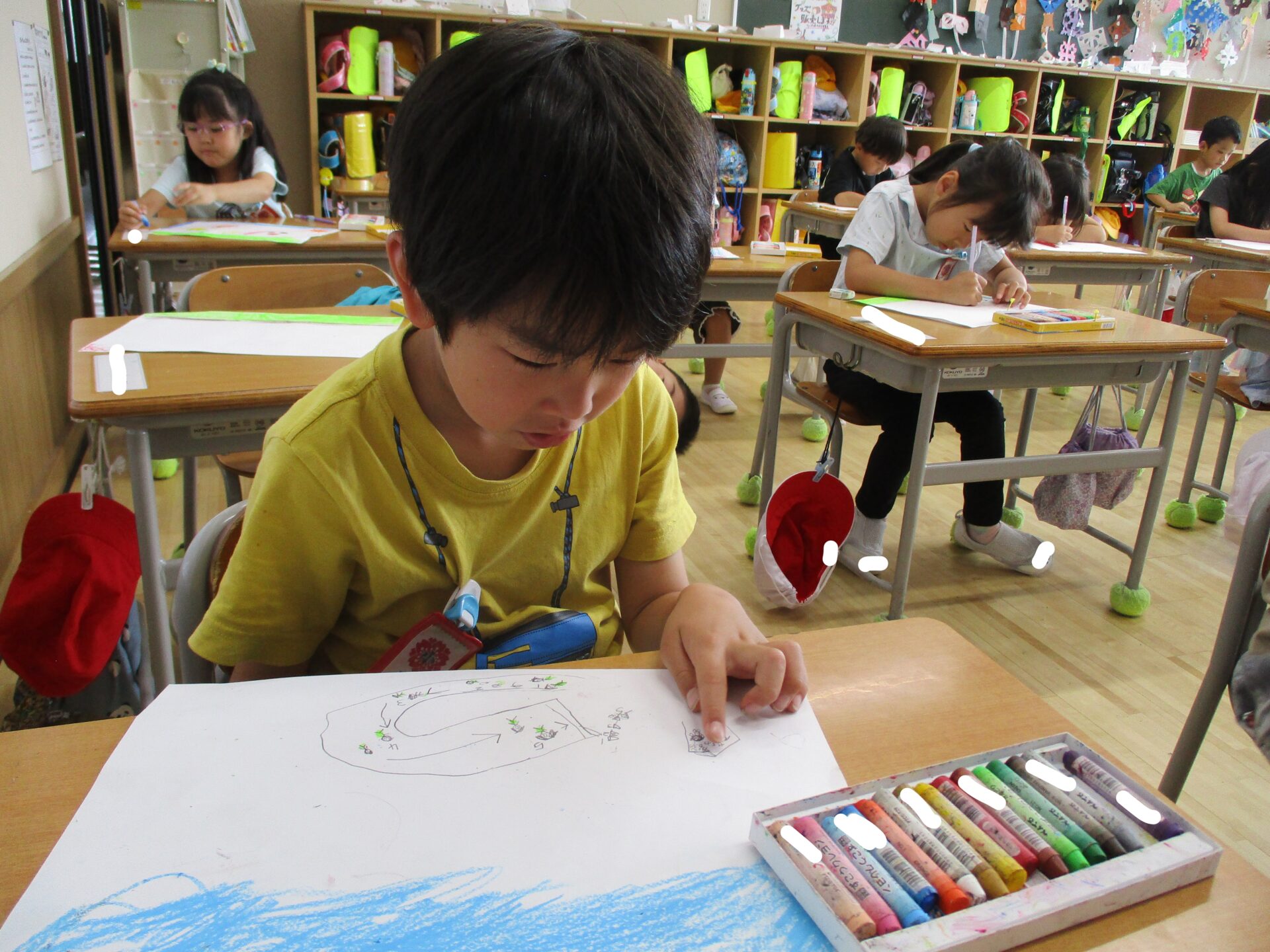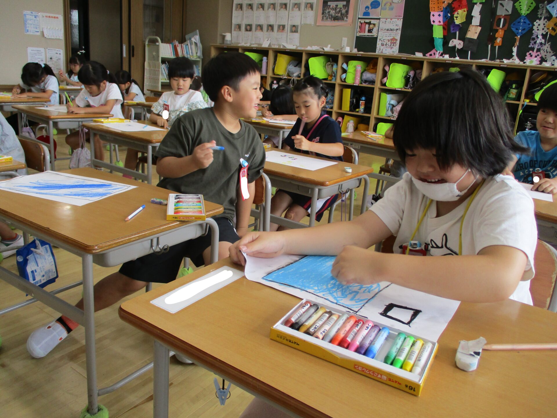 入学してから夏休み前までを振り返って、頑張ったこと、楽しかったことを1年生は絵に描きました。