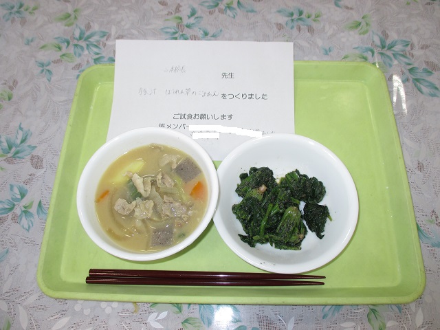 7年生は調理実習で豚汁とほうれんそうのごま和えをつくりました。職員室に届いた料理は、見た目も味も申し分のないおいしさでした。後期課程になって急に大人びてきた7年生ですが、こんなに難しい料理を協力し合って作れるようになったことにも驚かされました。「工夫した点はどんなことですか?」とたずねたら、「愛情を込めたところです!」と答えてくれました。7年生の皆さん、とってもおいしかったですよ。ごちそう様でした。