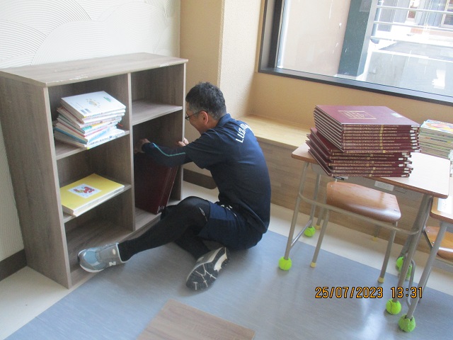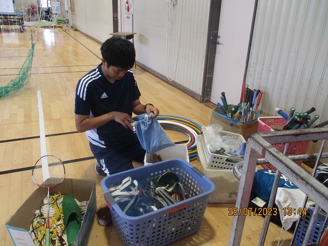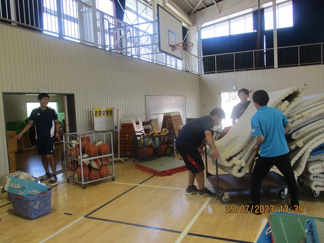 先生方も子供たちに負けじと、一昨日からみんなで職員作業を行いました。3月末に閉校した4校から運び込んだ大量の荷物や書類を整理するという大仕事です。箱の中に入ったままの書類や備品、教材を整理したり処分したりしました。体育館が解体されたため、体育関係の道具はすべて旧箒根中学校の体育館や校庭の体育倉庫に運び込んであります。体育主任の先生方を中心に作業を行いましたが、40度近い蒸し暑さの中で、汗だくになりながら頑張る姿は輝いて見えました。各教室の戸棚には不織布の目隠しをしてきれいに整えました。