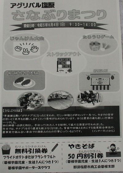 箒根学園が開校して丁度2か月間が経ちました。立ち止まる余裕もなく、走りながら考える日々が続いています。想定外の様々な出来事に「どうする、校長!?」と待ったなしの判断を迫られることも多々あります。それでも職員が一枚岩となって力を合わせ、保護者の力強い応援に支えられてなんとかここまで来れました。本校が直面する課題は沢山あるのですが、そのひとつに学校予算の厳しさがあります。必要最小限の予算立てをして学校が始まったのですが、やはり全くと言って良いほど余裕がありません。そうした現状を心配した保護者や地域の方が集まって、「箒根学園サポーターズクラブ」を立ち上げてくださいました。お祭りの出店や廃品回収を行って、そこで得た収益金を学校に寄付してくださることが活動の目的だそうです。なんと有り難いことかとただただ感謝することしかできません。早速、今週末の6月4日(日)にアグリパル塩原で開催される「さなぶり祭り」で屋台を出し、かき氷や焼き鳥、ポテトやフランクフルト、やきそばなどを安く販売します。本校の子供たちには無料券や割引券の付いたチラシが配付されました。(赤字にならないかと心配ですが、初めての活動なので子供たちが喜んでくれればそれでいいそうです。)是非日曜日のお昼(9時30分~14時)には、アグリパル塩原へお越し下さい。