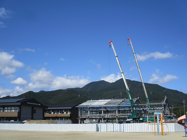 体育館の工事が目を見張る速さで進んでいます。近代工法、恐るべしです。