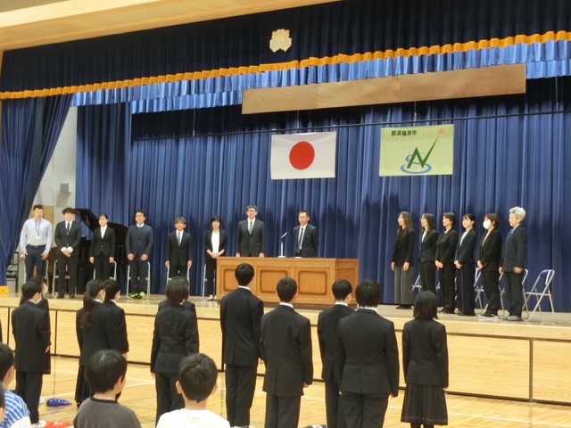 1日のスタートは「新任式」から。13名の新しい先生方を迎えました。一人ひとり自己紹介。