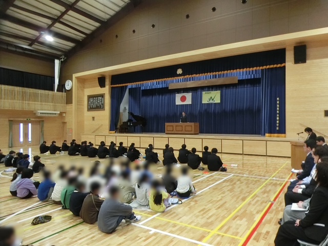 その次は「始業式」が行われました。校長先生から「明確な目標をたて、『人にやさしく自分に厳しく』を心がけ、希望に満ちあふれた学校にしていきましょう」との話がありました。