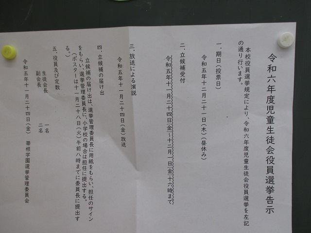 2023.12.09 学校だより 全校生 学校便り「一年草」12月号を掲載しました 管理者学校 12月9日(土) 昨日配付しました学校便り「一年草」12月号を掲載しました。是非御覧下さい。 R5学校便り12月号(箒根学園) 児童生徒会では次年度の役員選挙に向けて選挙活動が始まりました。箒根学園のリーダーとして頑張れる立候補者が肩を並べました。選挙権を持つ3年生以上の子供たちがどう動くか、楽しみに見守りたいと思います。 #全校生
