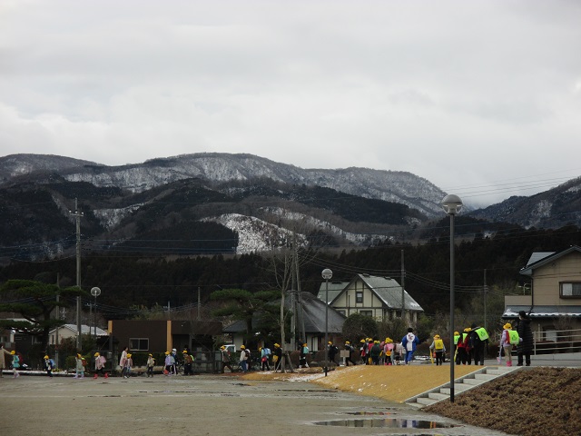昨日から降っていた雪が雨で溶け、校庭中が大きな水たまりのようになっていました。これでは運動靴で来る子供たちは歩かせることができないと、急遽道路の端をつたって体育館横の門から校内に入ってもらいました。徒歩通、自転車通、バス通、保護者送迎と通学方法が多様なので、普段から事故がないようにと祈りながら登下校指導をしています。体育館とその駐車場の完成を受けて、朝夕の動線を校内で検討していきたいと考えています。