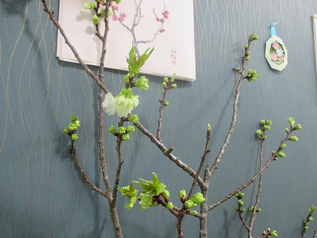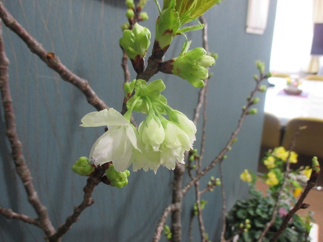 旧箒根中学校の校庭にあった桜の木が強風で倒れ、その枝を切ってきて1ヶ月近く職員室と校長室で世話をしてきました。枯れてしまうかと思っていたのですが、ここにきて一気に芽吹いてきたと思ったら、昨夜一輪花が咲きました。そのたくましさと生命力に驚かされたり励まされたりしています。