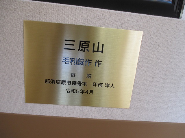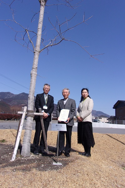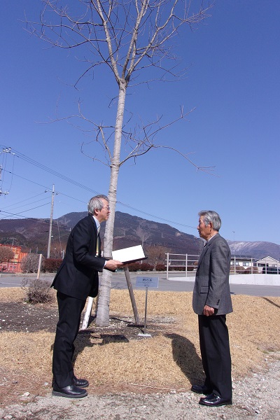 箒根学園開校にあたり、学問の木と言われる「楷の木」と巨大な絵画を寄贈くださった横林地区の印南洋人様に、教育委員会より感謝状が贈られました。お天気も良く、まずは楷の木の前で記念撮影を行いました。美しい木立は青空に映え、春になると緑の葉に覆われて子供たちを見守ってくれます。