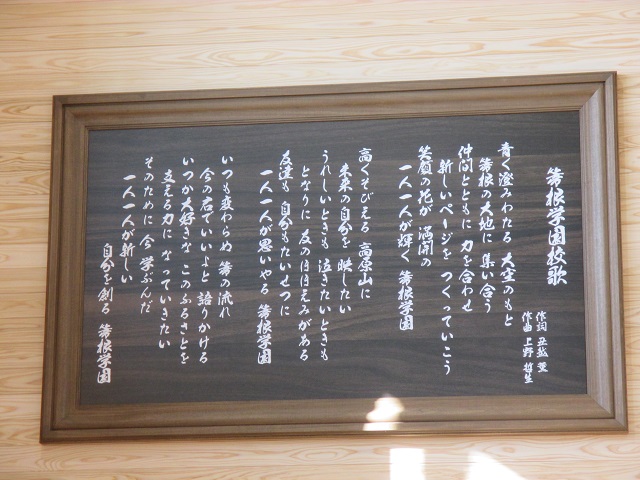 フロアをじっくり見つめた後はなぜか皆ではしりだして、床の感触を確かめました。その後はステージに上がったり2階にある通路を歩いたりして、五感をフル活用しながら新しい体育館を味わっていました。壁には芸術作品のように美しい校歌の額も設置されました。