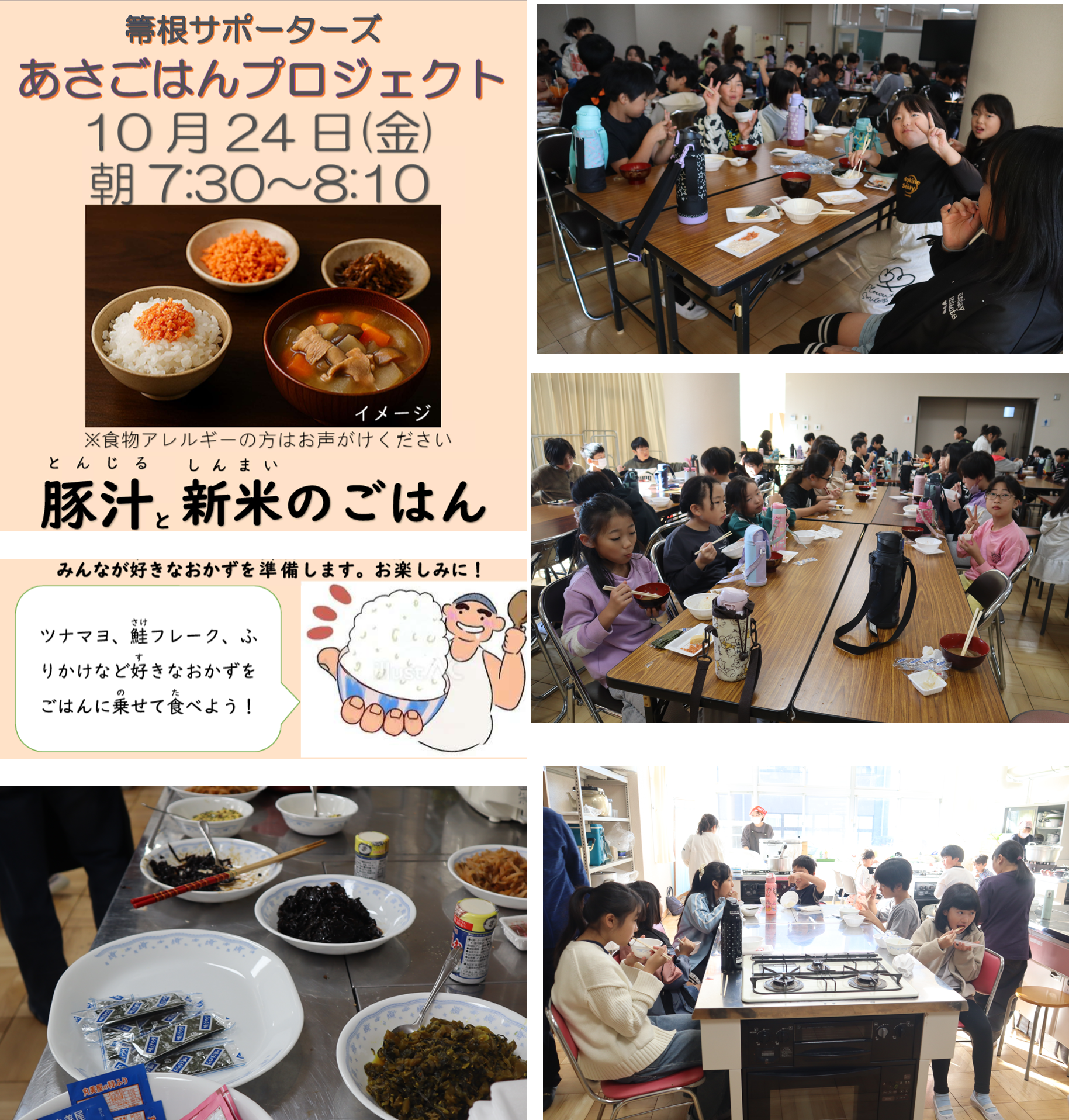 2025.10.24 全校生 朝ごはんプロジェクト10月24日(豚汁・新米) 管理者学校 10月24日(金)、「朝ごはんプロジェクト」を実施いたしました。 当日は、「温かい豚汁」と「つやつやの新米ご飯」をご提供いただきました。さらに、子どもたちが大好きなご飯のお供も多数用意していただき、皆でおいしくいただきました。 子どもたちは、大変喜んでいました。サポーターズの皆様、温かいご支援とご協力に心より感謝申し上げます。 #全校生