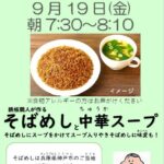 9月19日(金)に箒根サポーターズクラブの皆さんにより、朝ごはんプロジェクトが実施されました。「すべての児童生徒がおなかいっぱいご飯を食べて、学校生活を楽しくがんばってほしい」という思いから、月に1回程度「朝ごはんプロジェクト」と称して、児童生徒に朝ご飯が無償で振る舞われています。今回は、そばめしチ中華スープを提供されました。朝早くから焼きそばのソースの香りが漂い、児童生徒たちの顔も笑顔でいっぱいでした。そして、実際に食べてみると「おいしい!」という声が学校中に響き渡っていました。地域の方々の思いは児童生徒・職員に伝わり、一日を温かい気持ちでスタートさせることができました。サポーターズクラブの皆さんありがとうございました。