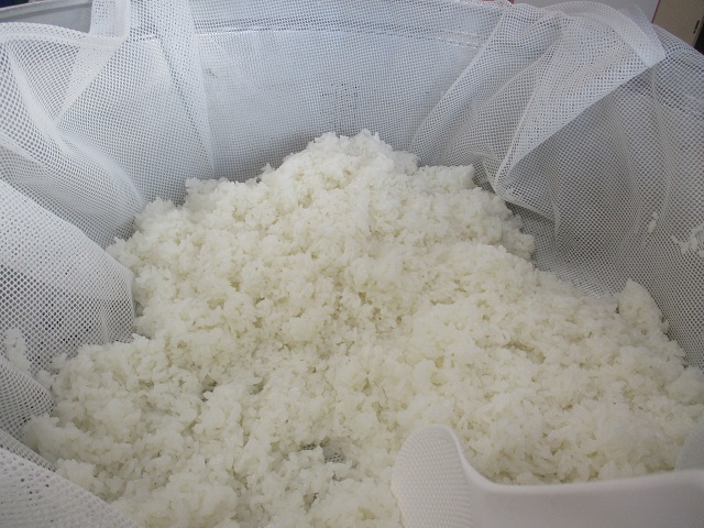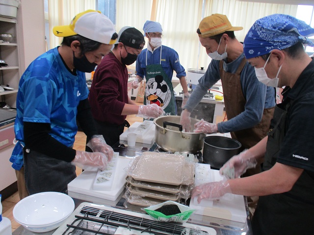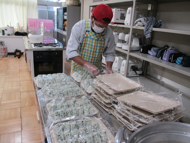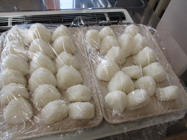 新米の味を楽しんでほしいと塩結びを50個、わかめのおにぎりを360個作る事になりました。今回からメンバーに加わったお父さん達も、「あちっ!」と言いながら炊きたての御飯をにぎり始めました。経験者のお父さん達は1年3か月のブランクを感じさせない手つきで、どんどんとおにぎりを握っては並べていきました。なんと6時50分には作り終えてしまい、おにぎりが乾いてしまわないように7時15分まで配膳を待つことになりました。