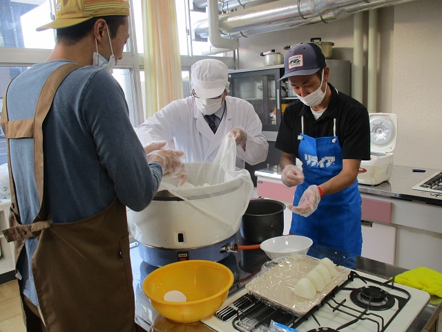 有り難いことにずっと使っていなかった炊飯器もちゃんと動いて、予定通り6時には御飯が炊き上がりました。新米なので水加減についてもみんなで話し合って決めたのですが、これもうまくいってほぼ完璧な炊き上がりとなりました。ここまで来れば今日の朝ごはんは成功したも同然です。当初は全体の動きが読めないため、パンとジュースだけの予定でしたが、子供たちからの「おにぎりが食べたい!」というリクエストに応えて、平山さんが作った新米でおにぎりを作ることになりました。