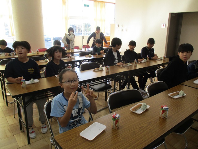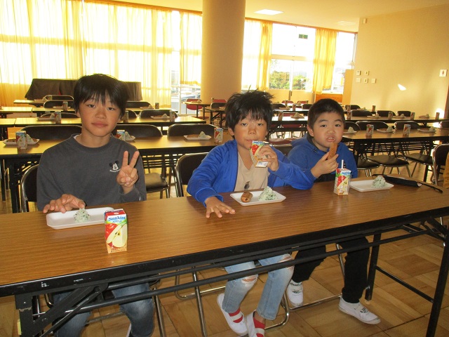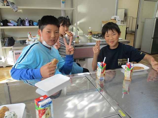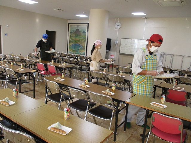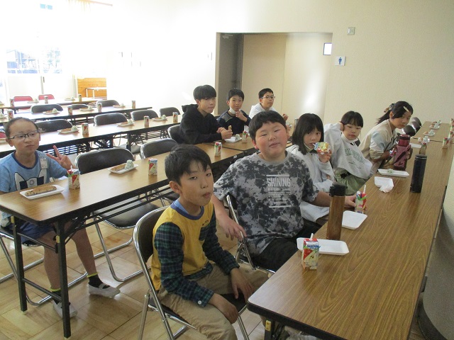 子供たちが授業に遅れないように時間を節約するため、テーブルの上にパンとおにぎりとジュースを配膳しておき、来た順に座るようにしました。お代わりがほしい子は手を挙げて運んでもらいます。7時20分を過ぎた頃から続々と子供たちがやって来ました。みんな「おー、久しぶり!!」「おいしそう!」とにこにこ笑顔です。3年間の積み重ねがあったため、心配していた子供たちの動きは大変スムーズでした。