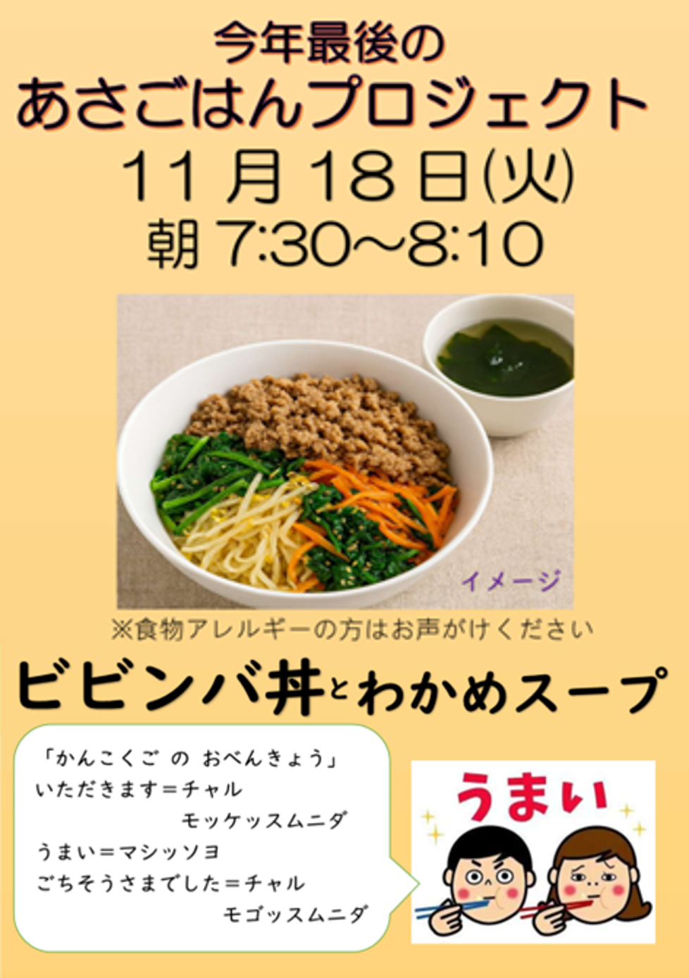 2025.11.18 全校生 朝食プロジェクト 管理者学校 11月18日(火)に今年度最後の**「朝食プロジェクト」**が実施され、ビビンバ丼とわかめスープが提供されました。 子どもたちは、今年度最後とあって、一口一口味わいながらいただきました。大変美味しく、心に残る朝食となりました。 サポーターズの皆様の温かいご支援とご協力に、心より感謝申し上げます。 #全校生