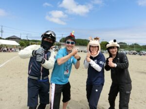 職員と総務部他有志のお父さん方は仮装をして職員種目に臨みました。子供たちにすこしでも多く楽しい思い出を作ってあげたいという精一杯の努力です。「みんなで仮装をしよう!」と職員会議で校長がお願いした時には、シーンと一瞬空気が固まったのでどうなるかなと不安があったのですが、みんなそれぞれに仮装用のアイテムを準備してくれていたのでほっとしました。教師生活の残り時間も短くなってきた昨今思うことは、楽しい学校作りには「馬鹿馬鹿しいことにも一生懸命」という姿勢が必要だということです。先生という鎧を脱いで一人の人間に戻って、子供たちの目線で物事を見て行動することが子供たちの心を開くきっかけになると感じているからです。