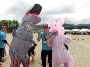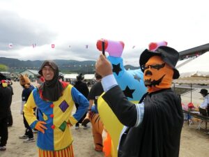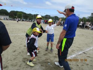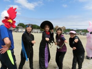 職員と総務部他有志のお父さん方は仮装をして職員種目に臨みました。子供たちにすこしでも多く楽しい思い出を作ってあげたいという精一杯の努力です。「みんなで仮装をしよう!」と職員会議で校長がお願いした時には、シーンと一瞬空気が固まったのでどうなるかなと不安があったのですが、みんなそれぞれに仮装用のアイテムを準備してくれていたのでほっとしました。教師生活の残り時間も短くなってきた昨今思うことは、楽しい学校作りには「馬鹿馬鹿しいことにも一生懸命」という姿勢が必要だということです。先生という鎧を脱いで一人の人間に戻って、子供たちの目線で物事を見て行動することが子供たちの心を開くきっかけになると感じているからです。