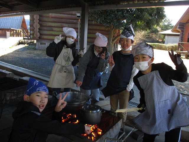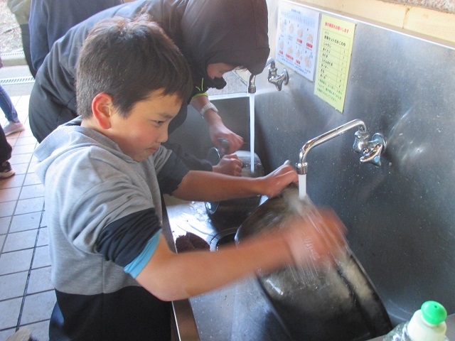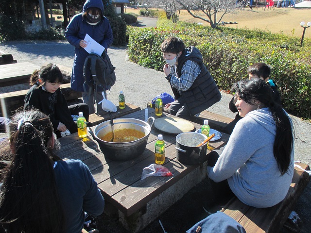 お日様は出ていましたが冷たい強風にあおられて、炊きたてできたてのカレーが瞬間冷凍のようになりました。それでも自分達で作ったカレーの味は最高で、「うちの班の方がおいしいよ!」とお互いに味自慢をしていました。ほとんどの班がカレーも御飯も完食です。最後の後片付けも冷たい水にひるむこと無く、一発合格を目指してがんばりました。