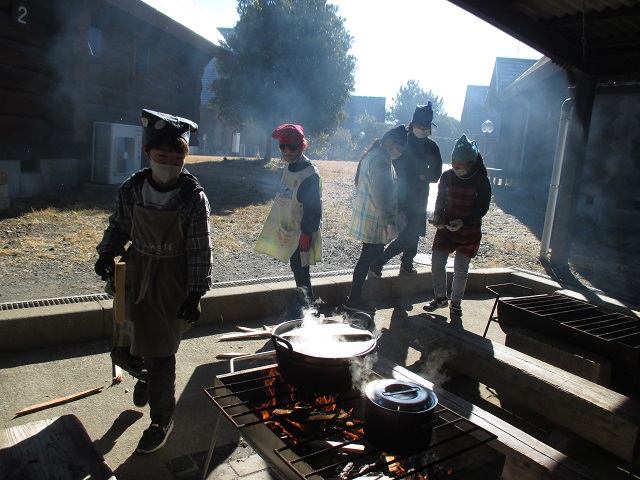 2日目の午前中は野外炊飯です。たきぎを燃やして火をおこし、野菜を刻んで大鍋でカレーを作り、大きな炊飯鍋で御飯を炊きました。火を使うので暑くなるのではないかと思っていたのですが、冷たい強風が吹き抜けて寒さとの戦いになりました。