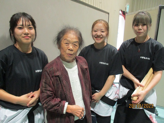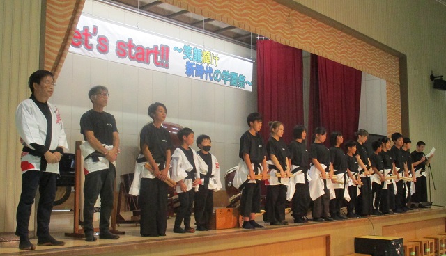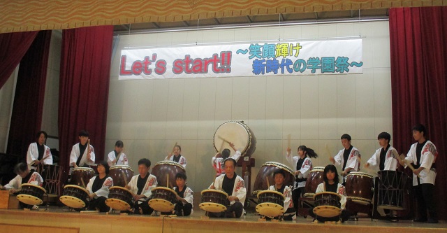 計画の段階では時間がないと言うことでプログラムから一度外されていましたが、地域との結びつきを強くするためにも是非とも演技して頂きたいと思い、昼食の時間を利用したアトラクションとしてプログラムに復活させました。果たしてその結果は、大成功でした。一般の方々も含めほぼ全校児童生徒も鑑賞させて頂きました。じっとしていられないだろうからと、途中から遅れて着席させた低学年の子供たちも、その迫力ある演奏に引き込まれ微動だにせず集中して舞台を見つめていました。近くにいた2年生の男の子が「最初から見たかったな。」とつぶやいていたほどです。
