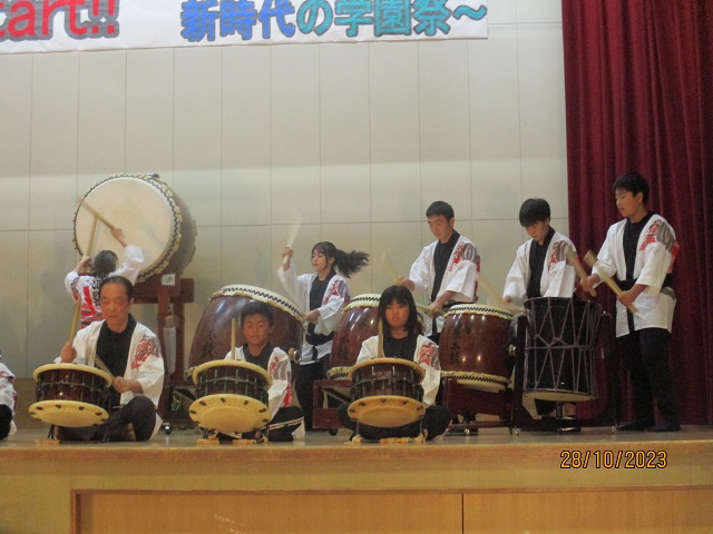 昼食休憩の時間を利用して、流響塩原太鼓の演奏がアトラクションとしてありました。コロナ禍以前は小・中学校の文化祭等で披露していたそうですが、大人の方も入っての本格的な演奏は4年ぶりのことです。本校の子供たちも一緒に混じって、真剣な表情で太鼓をたたいていました。