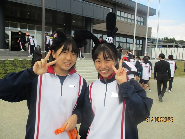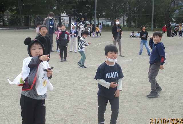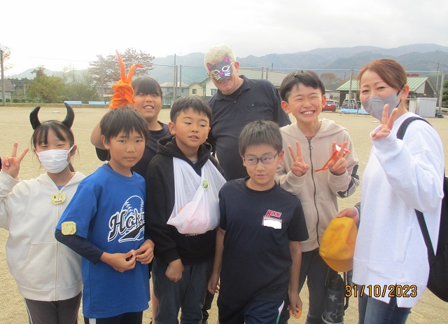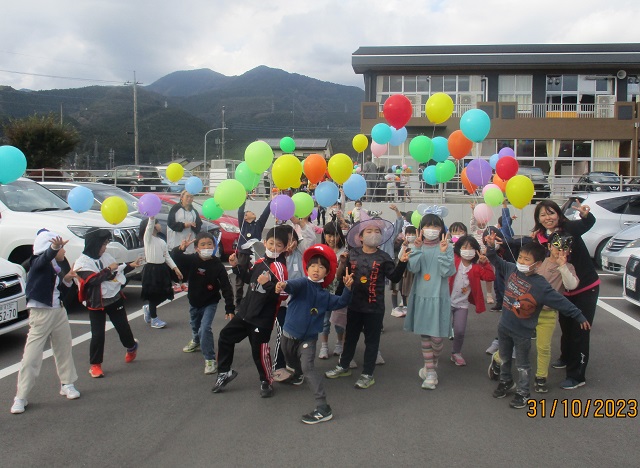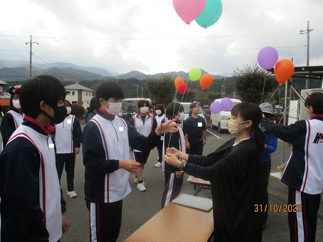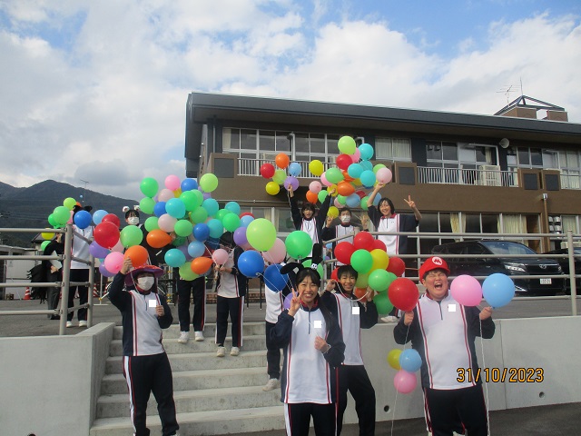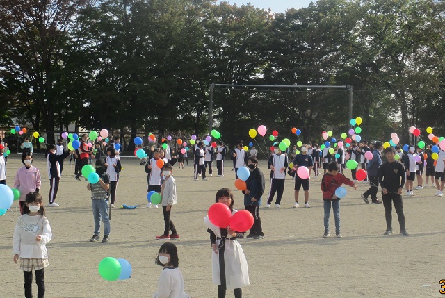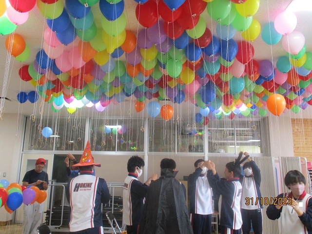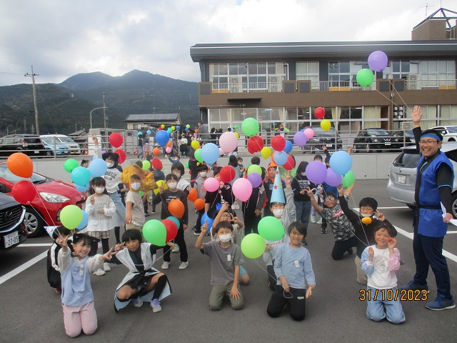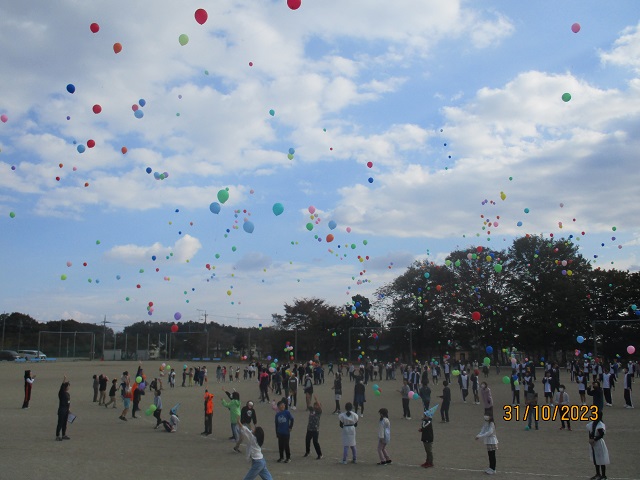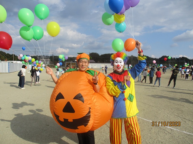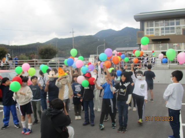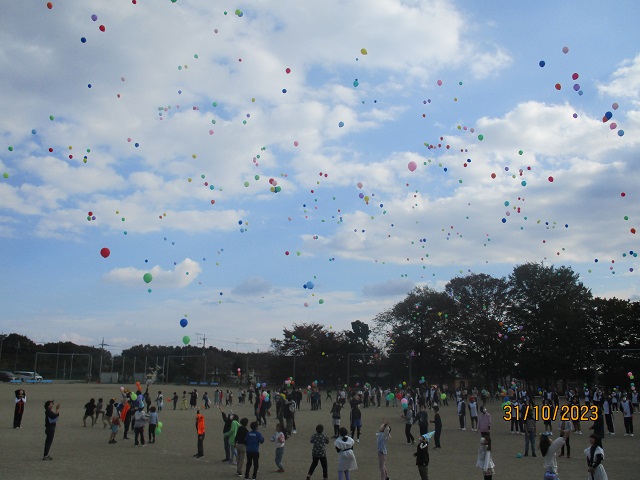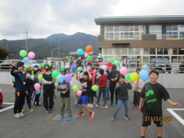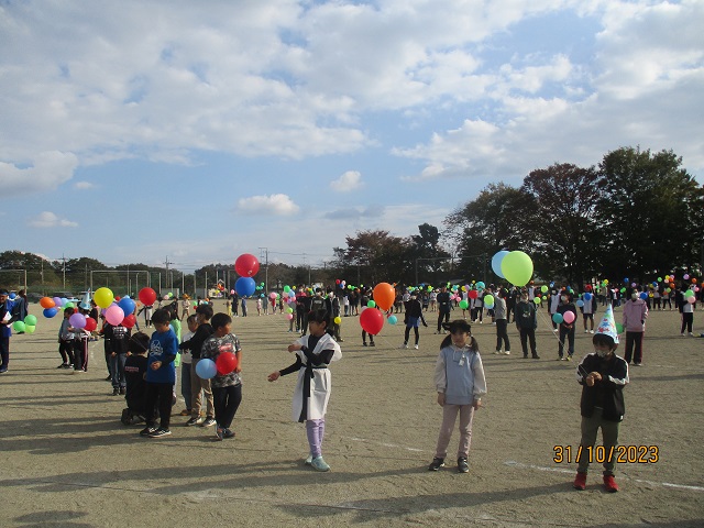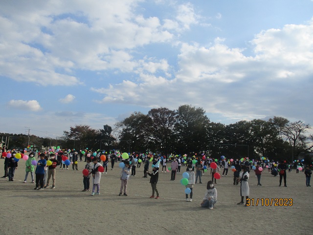 いよいよバルーンリリースになりました。思い思いの小物を身に付けて、子供たちが集まってきました。保護者も職員も仮装をして雰囲気を盛り上げます。9年生の子供たちにはバルーンの受け渡しを手伝ってもらいました。保護者の手を借りなくても自分達でどんどん動いてくれるので大助かりです。義務教育学校の良さを改めて感じることができました。