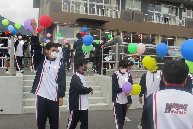 校庭に三重の円を描いて準備が整うと、生徒会長Wさんの「5.4.3.2.1.0 箒根学園開校おめでとう!」のかけ声で一斉にバルーンが解き放たれました。