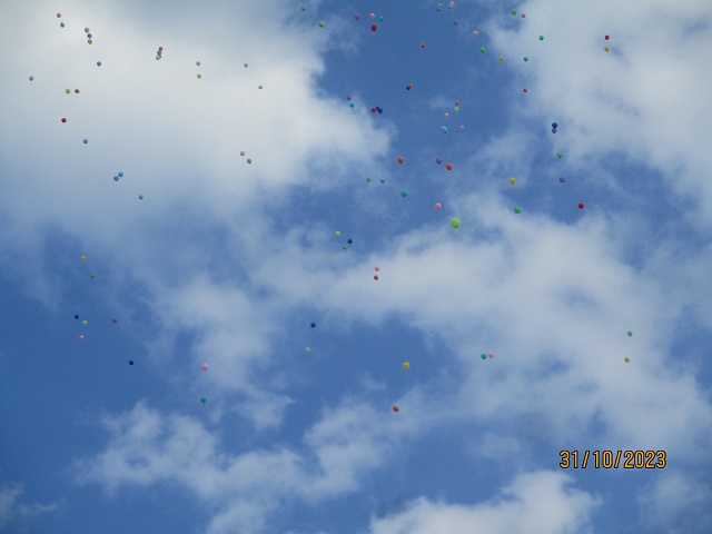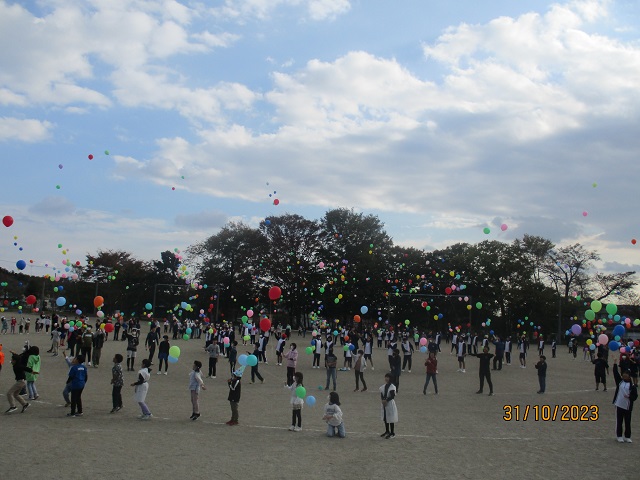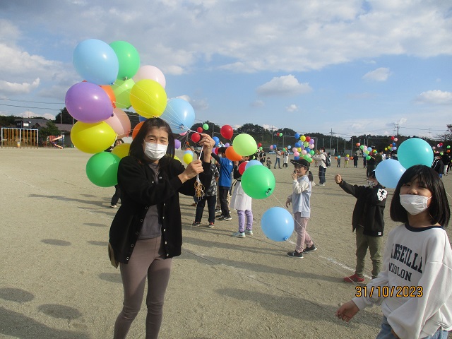 風に乗って舞い上がる色とりどりの風船に、子供たちから歓声とどよめきが上がりました。天高く青空に吸い込まれていく風船をみんなで最後まで眺めていました。
