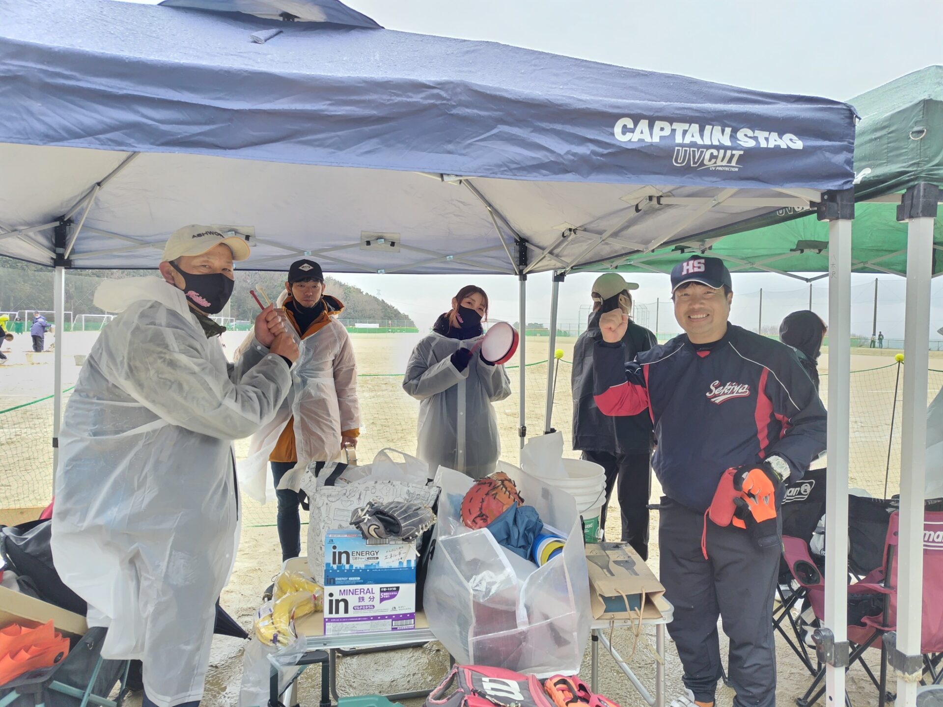 そして、今日は2時間遅れで試合開始となりました。会場となった府立スポーツ広場に行ってみると、連日の雨でグランドはぬかるんでいて、砂を入れるなどのグランド整備に関係者の方々が汗を流して下さっていました
