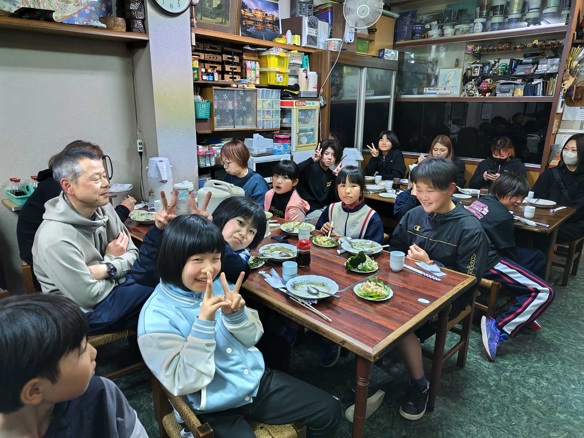 翌日23日(土)は開会式が予定されていましたが、雨天のため中止になりました。夕方に宿舎となっている民宿を訪ねたところ、丁度夕食の時間で、全員と会うことができました。子供たちは元気でほっと一安心です。