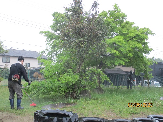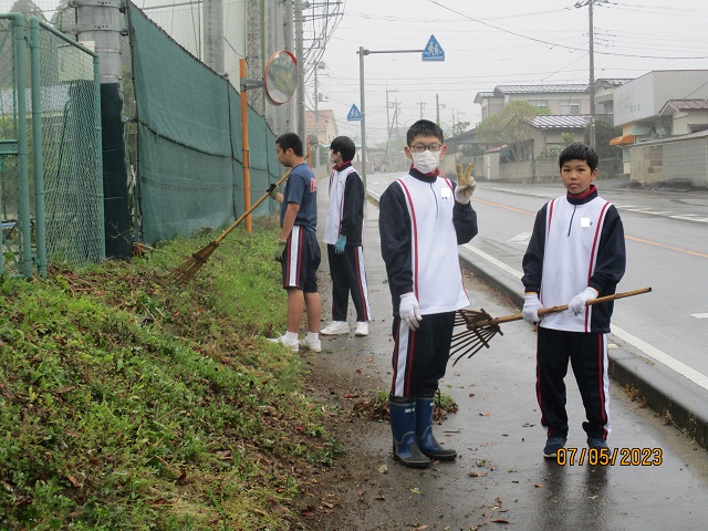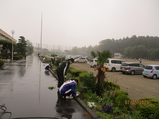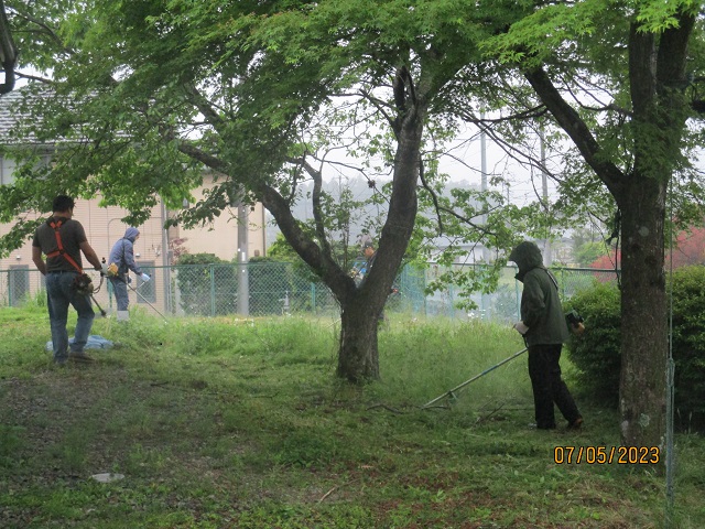 PTA会長さんや事業部長さんの御挨拶の後、両校で同時に活動を始め、除草や草刈り等の作業を行って頂きました。後期課程の子供たちが雨に濡れながら一生懸命働いている姿に、さすがだなと感動を覚えました。雨が少し強くなってきた7時30分に作業を終えましたが、どちらの校庭もすっかりきれいになりました。これで安心して体育祭を迎えることが出来ます。