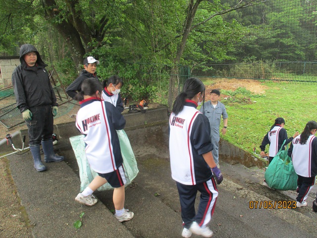 箒根学園は旧箒根中学校も管理下にあるため、前期課程の保護者の方には箒根学園の校庭とその周辺を、後期課程の子供たちとその保護者の方には旧箒根中学校の校庭とその周辺をお願いする事にしました。お天気も良くないのでどれくらいの方が協力してくださるかと少し不安でしたが、皆さん雨合羽を羽織って沢山の方が集まってくださいました。