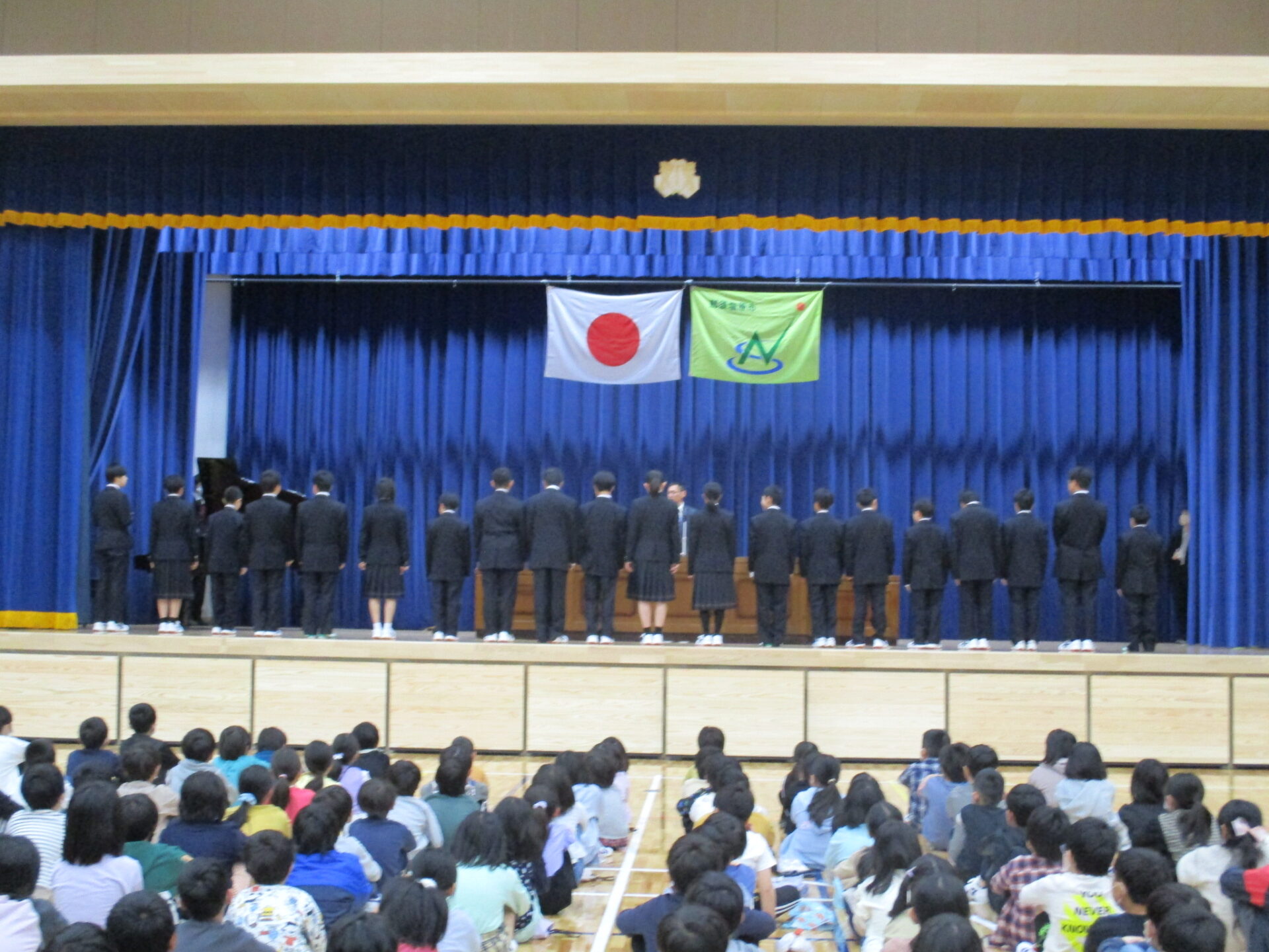 【新任式】今年度、新たに6名の教職員を迎えしました。新任の先生を教頭から紹介された後、一人一人自己紹介を行いました。そして、児童生徒会の代表者から歓迎の言葉がありました。