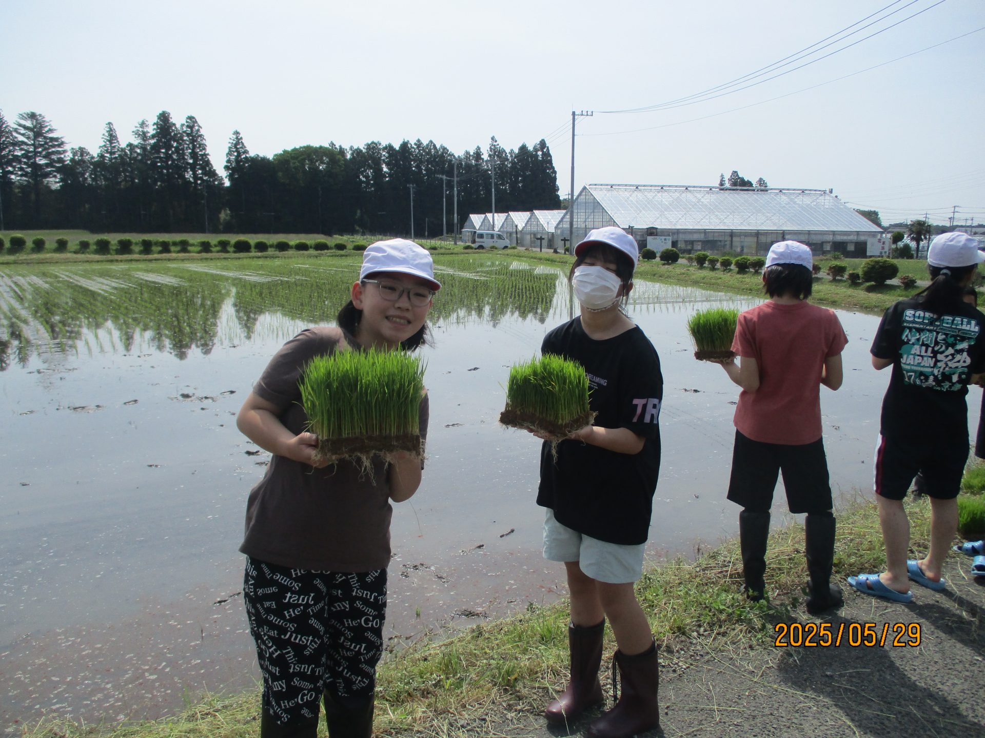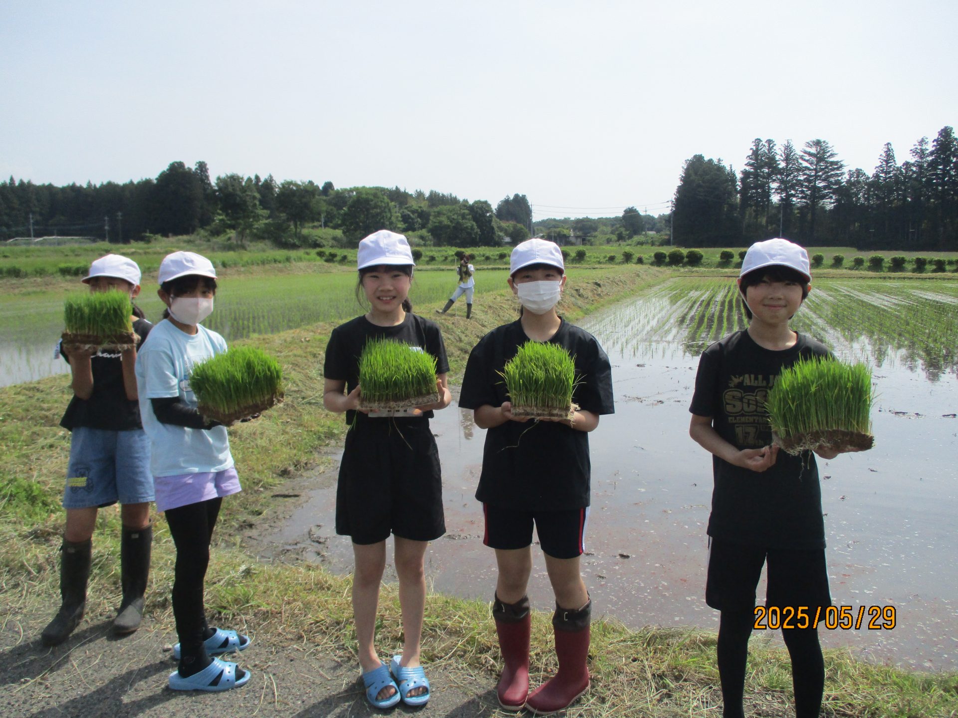 2025.05.29 全校生 5年生が田植え体験をしました。 管理者学校 5年生が総合的な学習の時間の勉強で、田植え体験をしました。 サポーターズクラブの方の多くの御協力をいただきました。 実際に水田に入り、苗を手で植えて子供たちは大興奮。 苗がどのように成長していくのか、お米がどのようにたくさん実るのか、これから成長をみていくのが楽しみです。