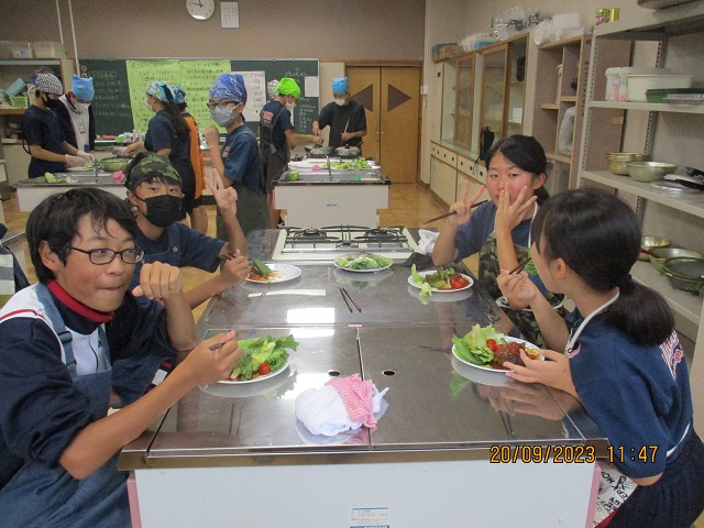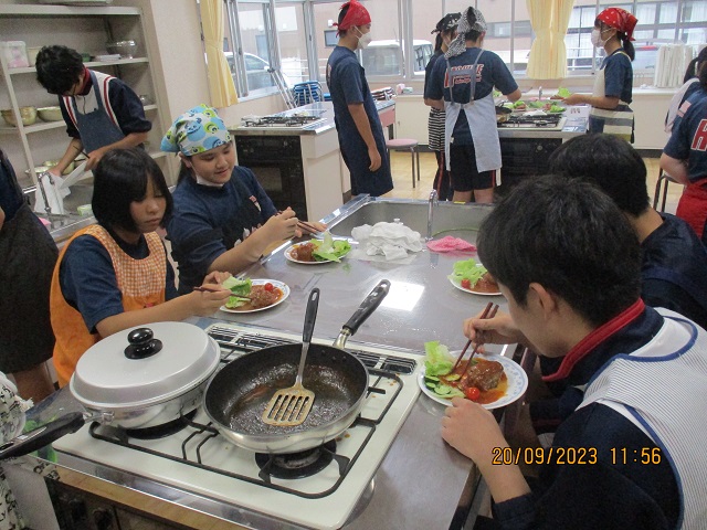 様子を見に行ったら、家庭科室のある校舎の廊下はすごくいい匂いで満たされて、一気に空腹を感じてしまいました。ドアを開けた向こう側では、楽しそうに煮込みハンバーグを煮込んだり盛り付けたりしているところでした。一人あたり80グラムのお肉にしてはその倍くらいに感じるボリュームだったので、その理由をたずねたところ、H先生の育てたおいしいタマネギを沢山入れたので大きくなったそうです。