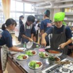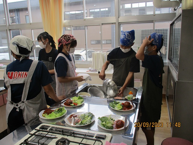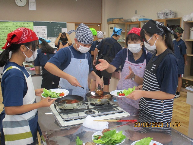 様子を見に行ったら、家庭科室のある校舎の廊下はすごくいい匂いで満たされて、一気に空腹を感じてしまいました。ドアを開けた向こう側では、楽しそうに煮込みハンバーグを煮込んだり盛り付けたりしているところでした。一人あたり80グラムのお肉にしてはその倍くらいに感じるボリュームだったので、その理由をたずねたところ、H先生の育てたおいしいタマネギを沢山入れたので大きくなったそうです。